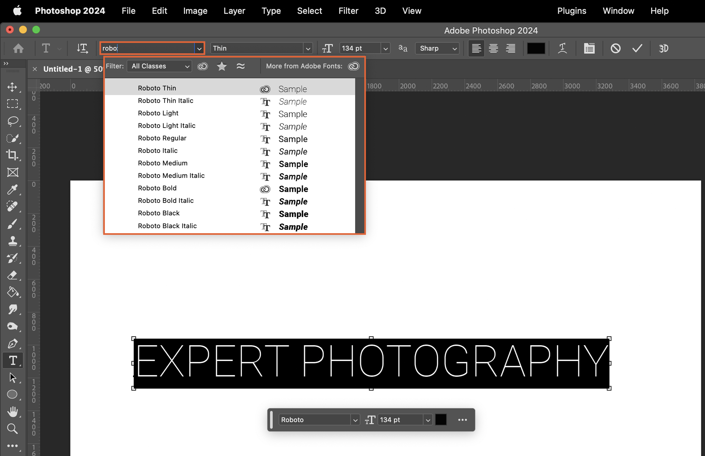 With the Text Tool active, look at the options bar at the top of the screen. Click on the current font name to open the font dropdown menu.