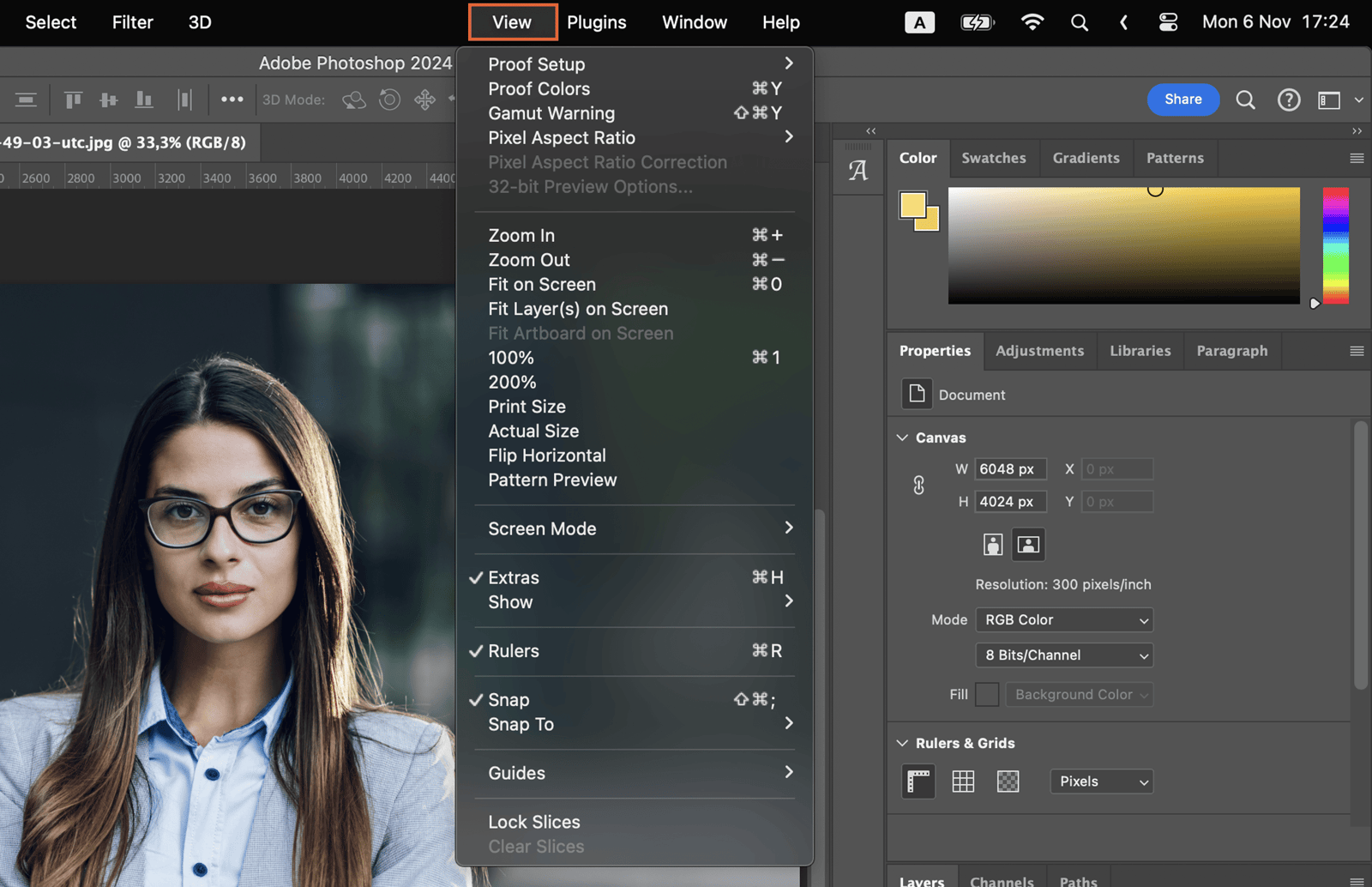 Start by launching Photoshop on your device. Open your desired image. Navigate to the top menu bar and click on ‘View’. This will drop down a menu list.