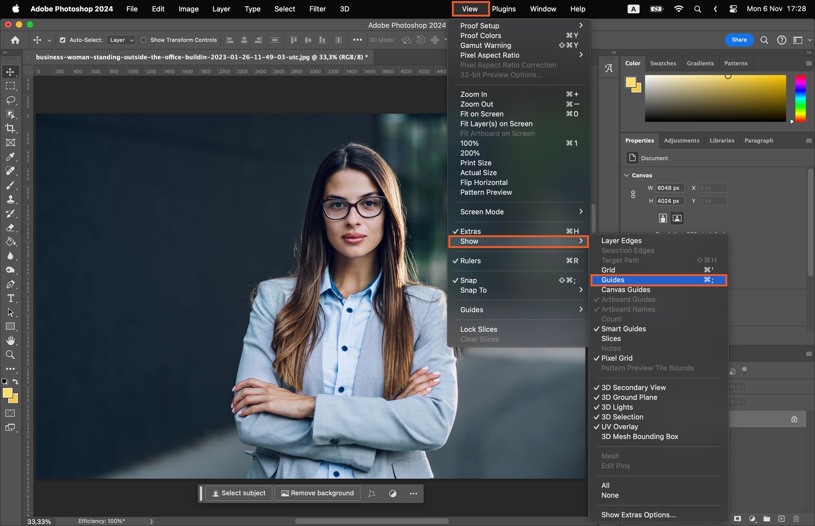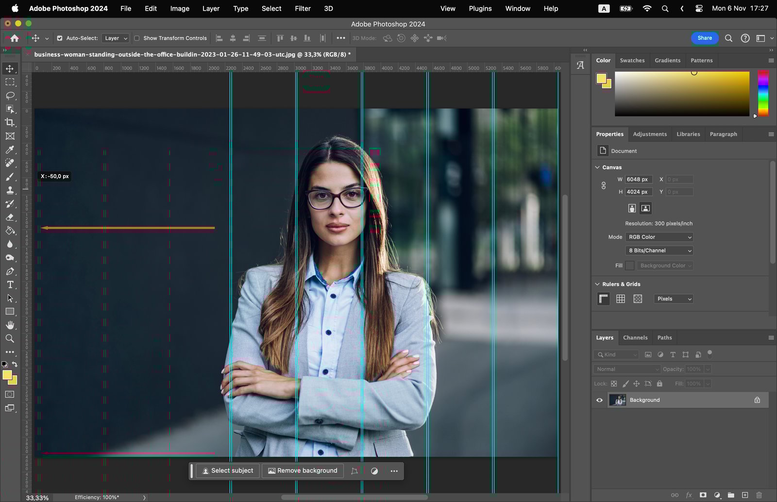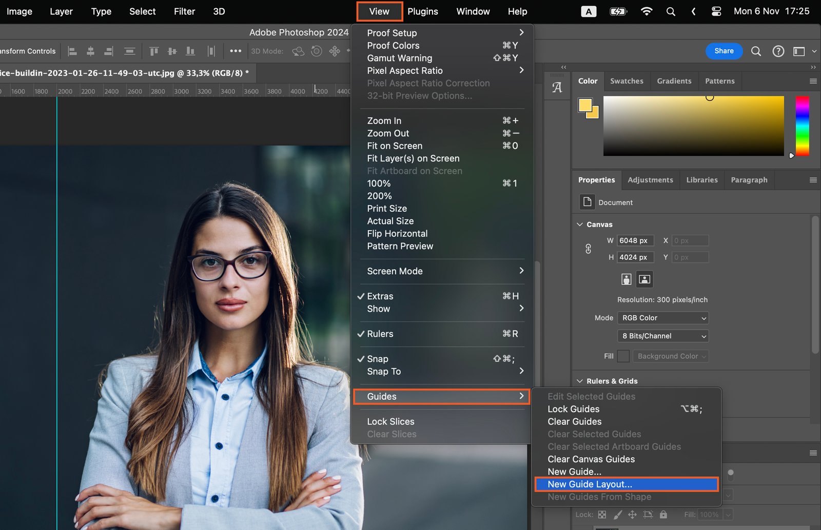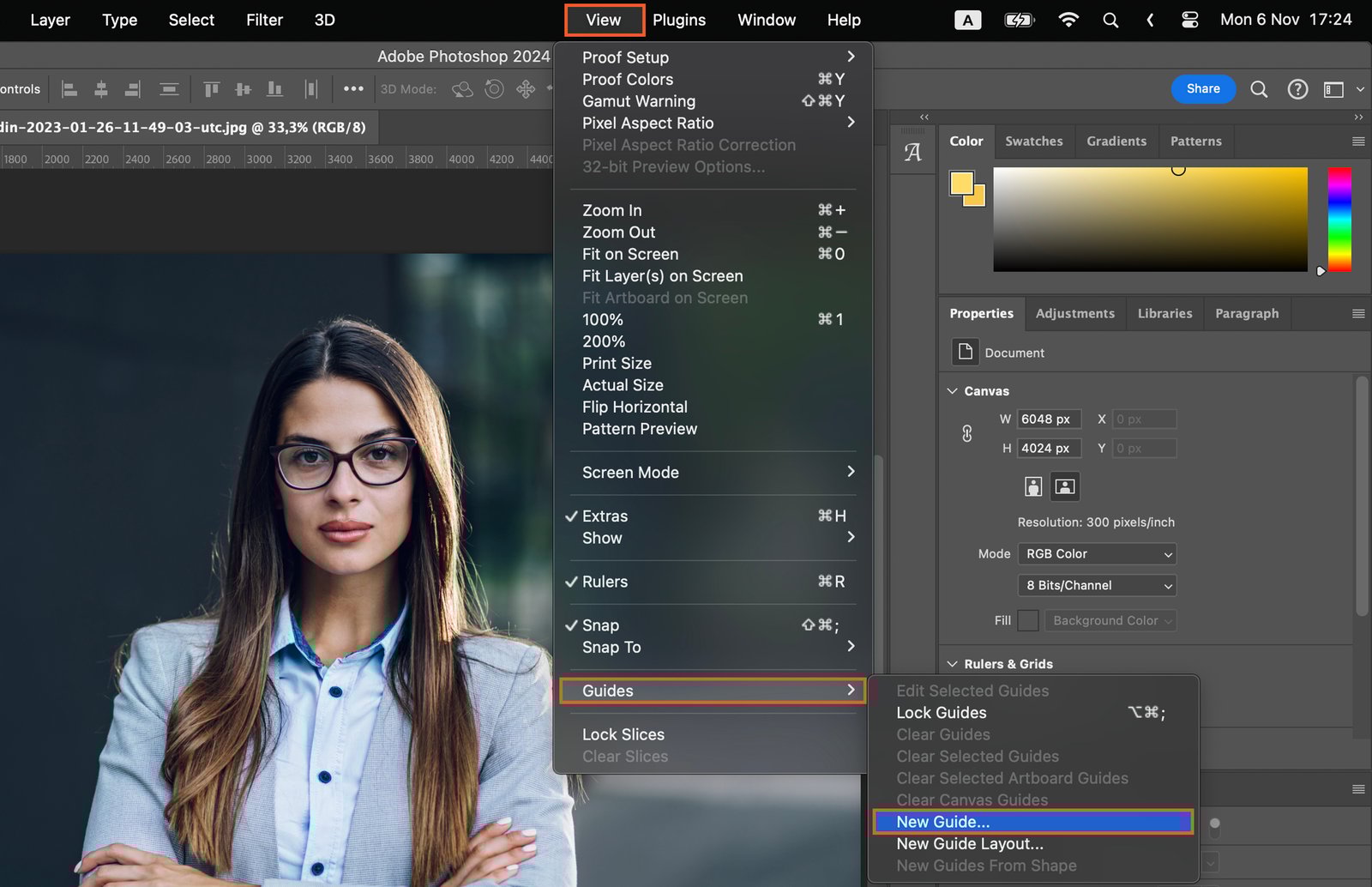 For multiple guides, use the ‘New Guide Layout’ option in the ‘View’ menu. This feature allows you to add rows, columns, and margins to your image.