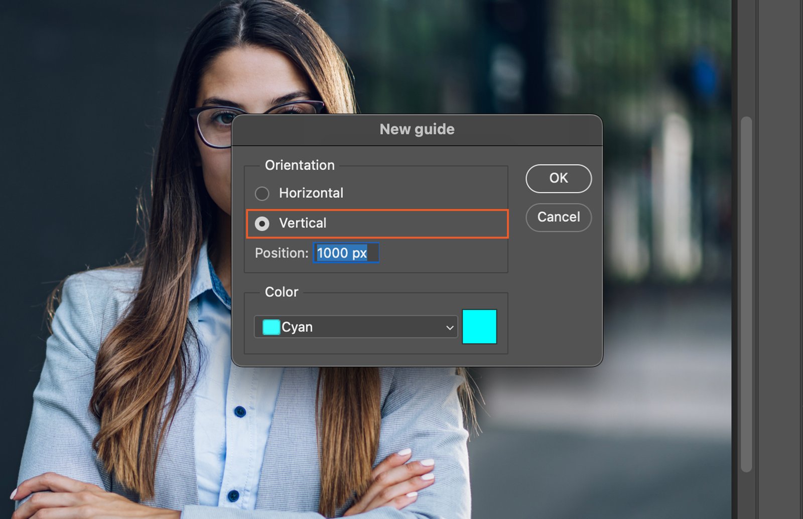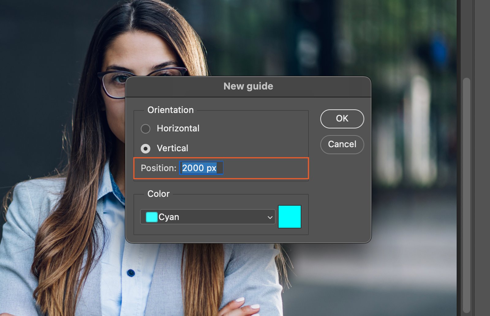 Enter a value in the ‘Position’ box to set your guide’s location. You can input the value in pixels, inches, centimeters, or percent of the image size, depending on your needs.