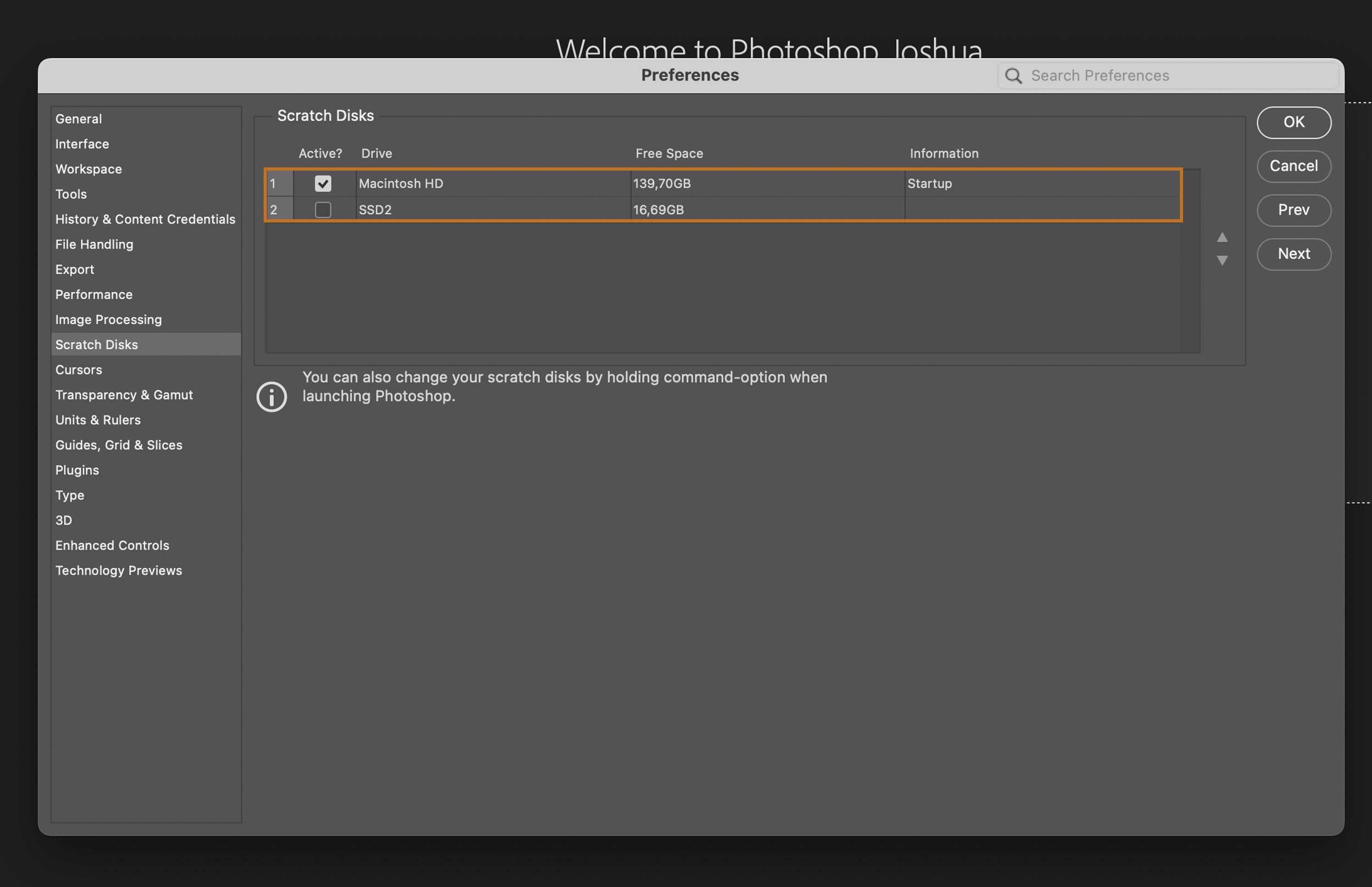 You can also use an external SSD as a scratch disk. Just make sure it’s connected before you start Photoshop, and then select it from the list.