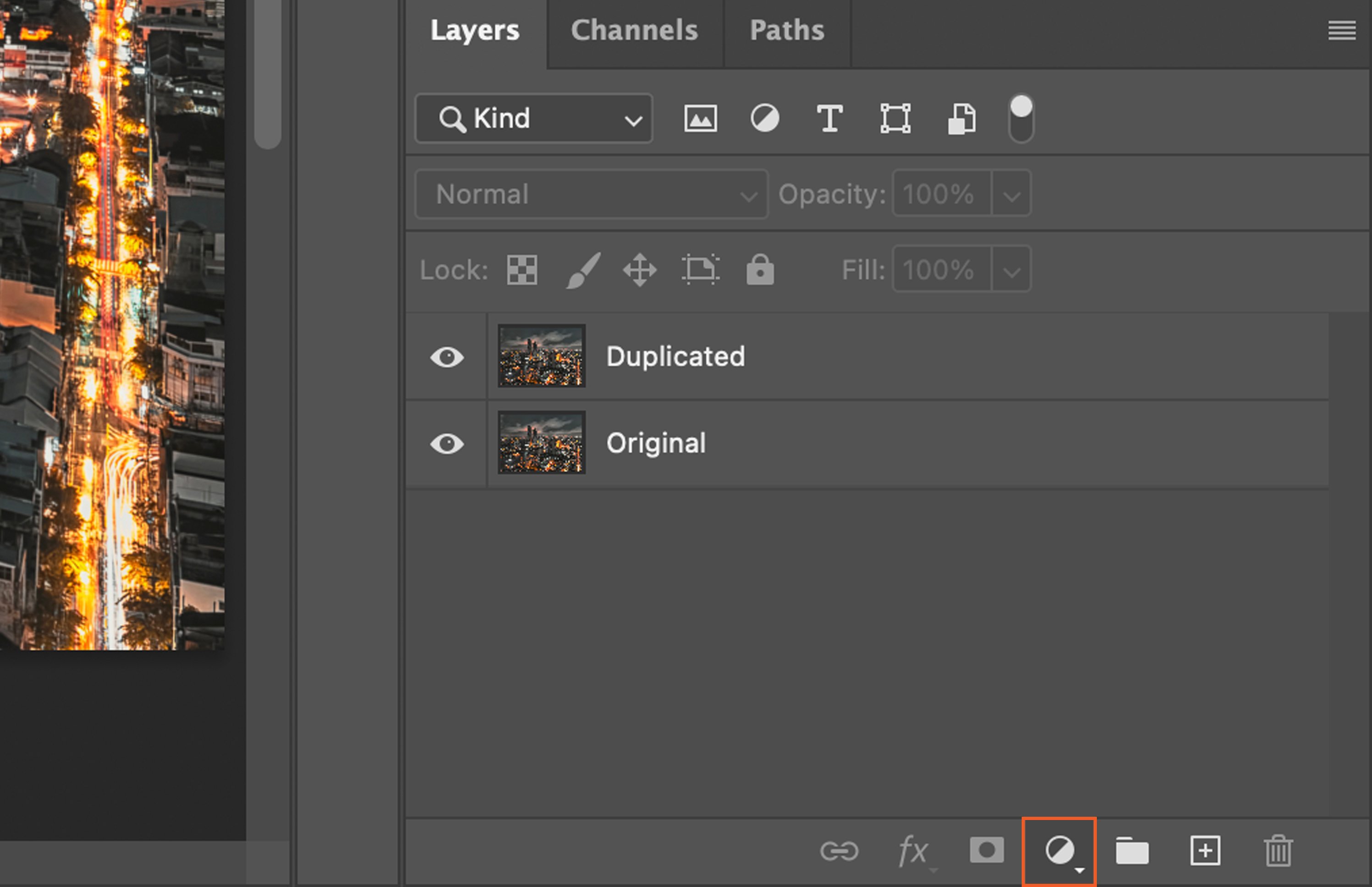 Next, select the Adjustment Layer. This is done by clicking on the half-filled circle at the bottom of the Layers Panel. A list of options will appear.