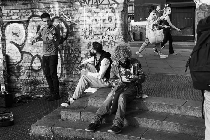 This street photo of musicians in London’s Camden Market becomes classic with the BW07 black-and-white conversion applied.