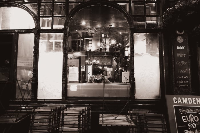 Here is a modern scene of a man seated alone in a restaurant window with the vintage look created by BW03.