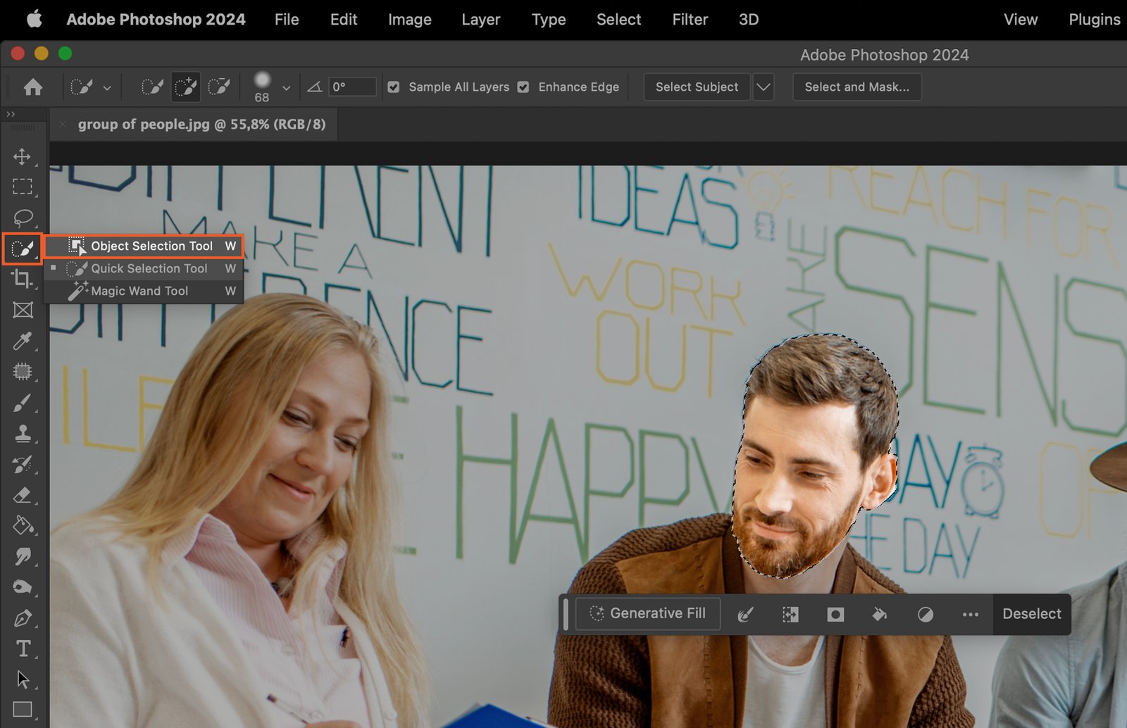 The Quick Selection Tool is a more automatic option. Click on the tool, then click and drag over the face. Photoshop will auto-select the face for you. Adjust the size of the tool for better accuracy.