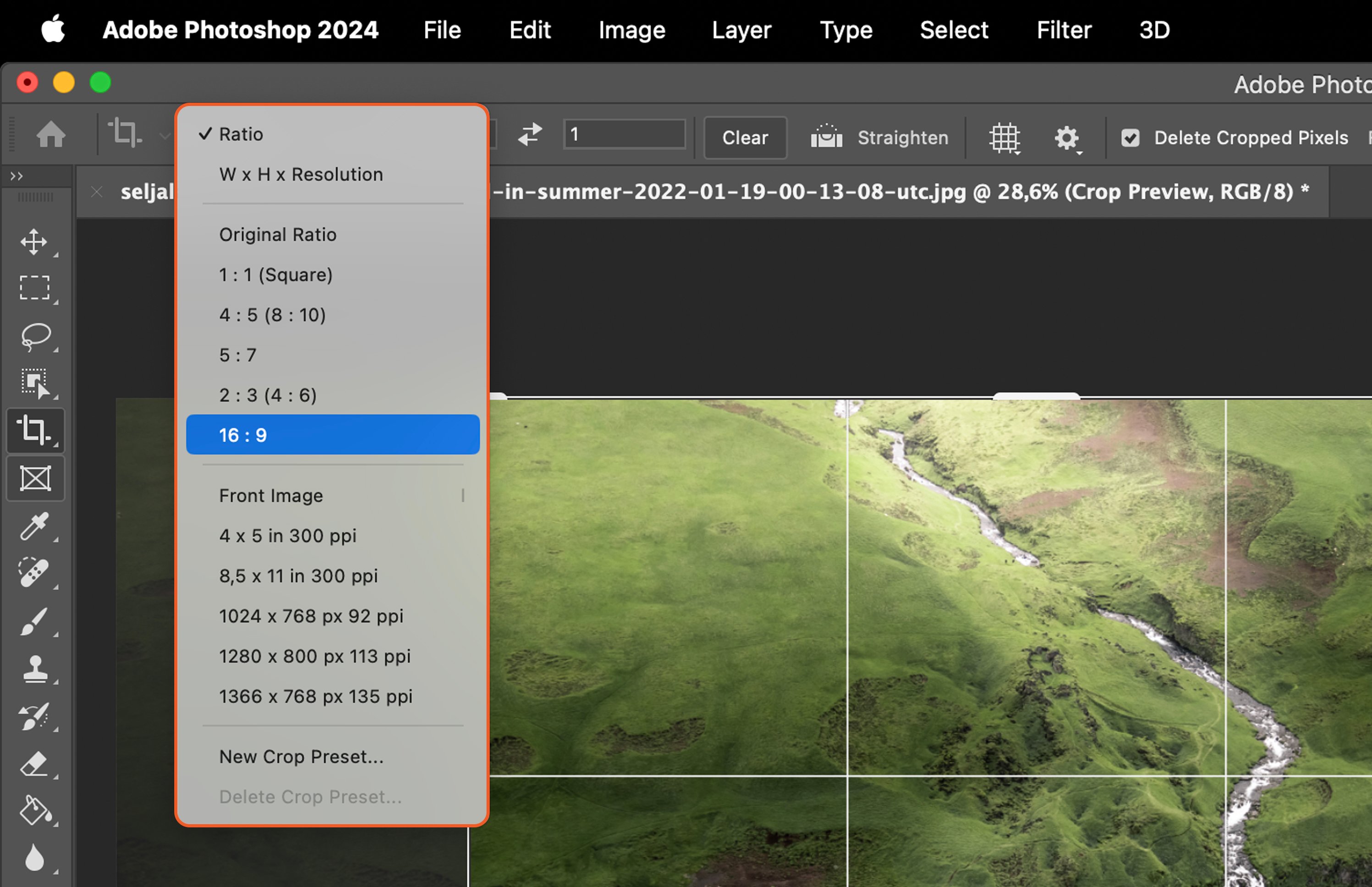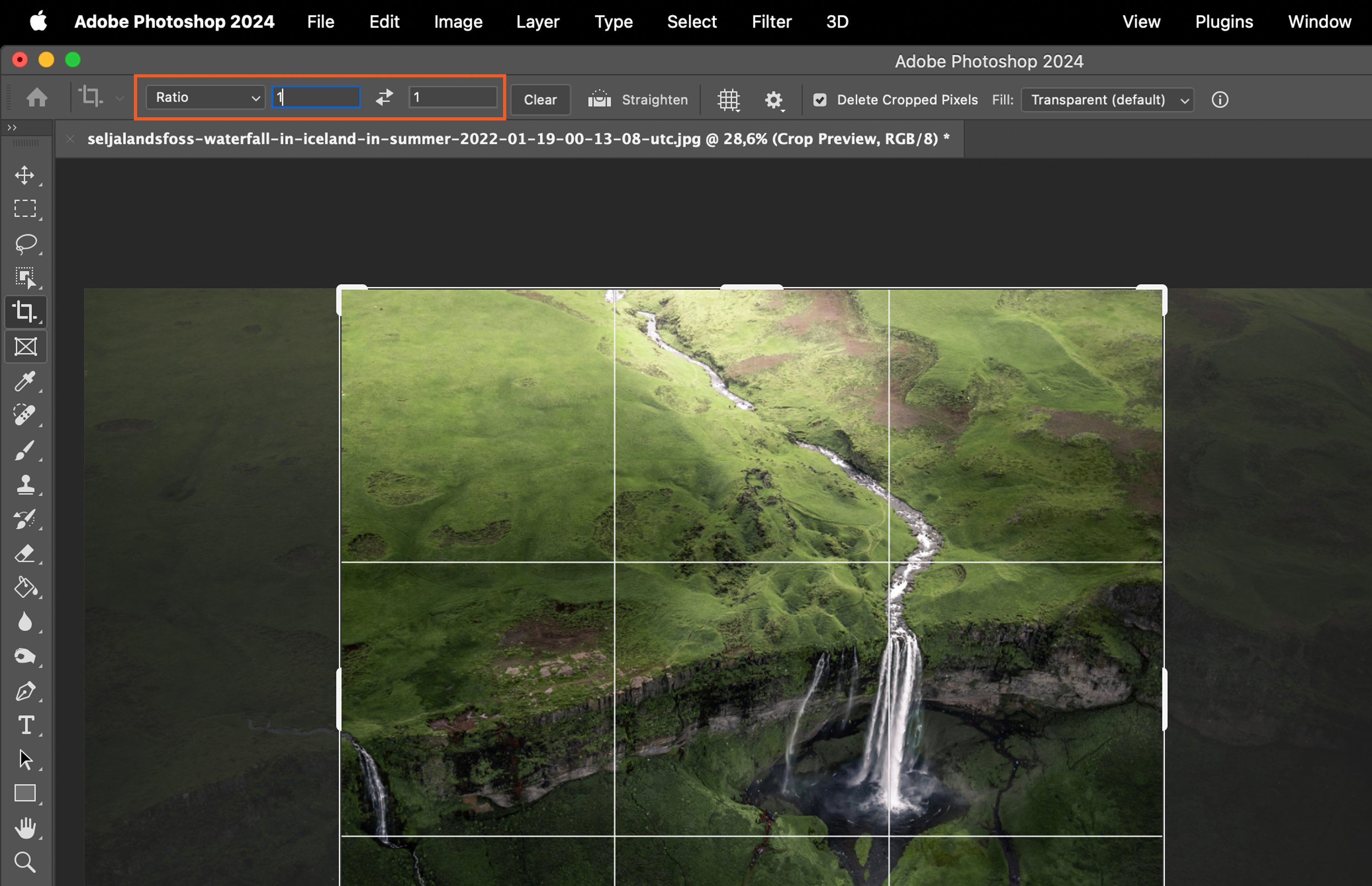 Photoshop also offers preset aspect ratios. To use these, click on the “Aspect Ratio” dropdown and select your desired ratio, like 1×1 for a square image.
