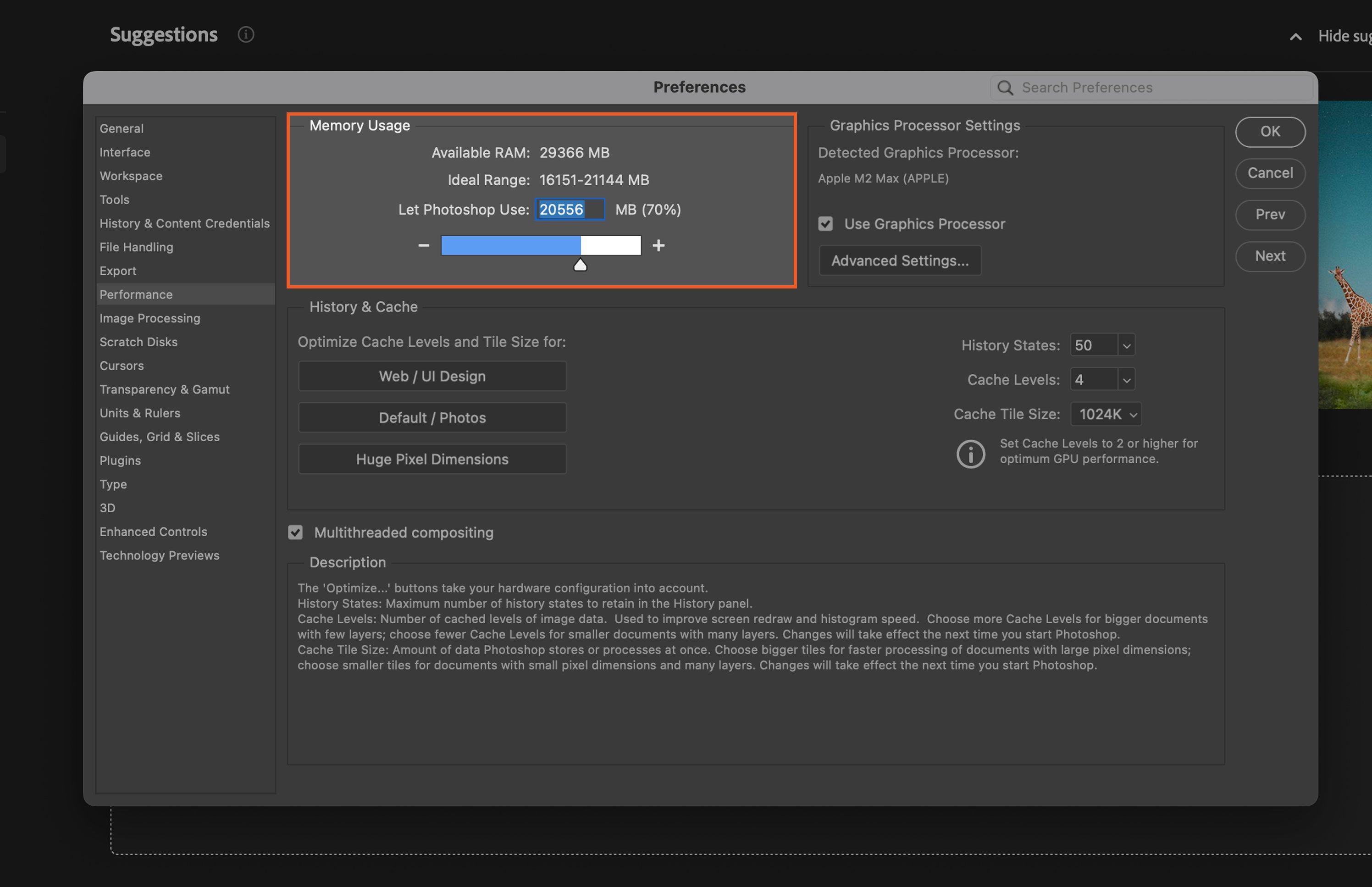 You can allow Photoshop to use more of your system’s RAM by going to Edit > Preferences > Performance. Increase the Memory Usage percentage to give Photoshop more RAM to work with.