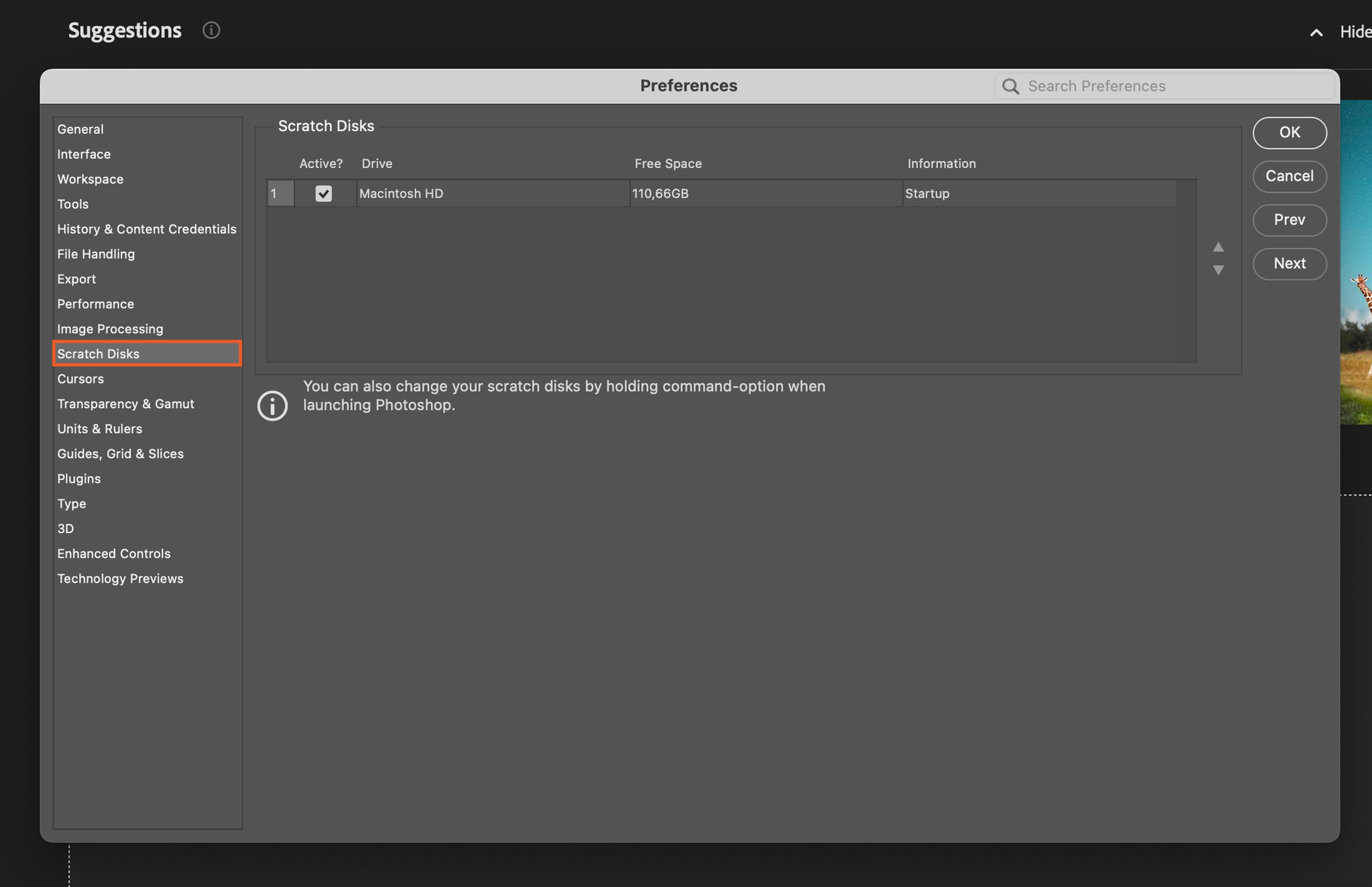 To review your current scratch disk settings, open Photoshop and go to Edit > Preferences > Scratch Disks (Adobe Photoshop (Top left corner)> Settings > Preferencies on MAC). Here, you’ll see a list of active and available drives that Photoshop can use as scratch disks.