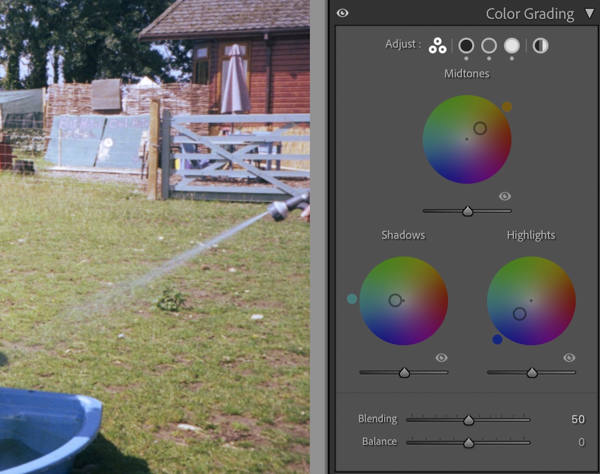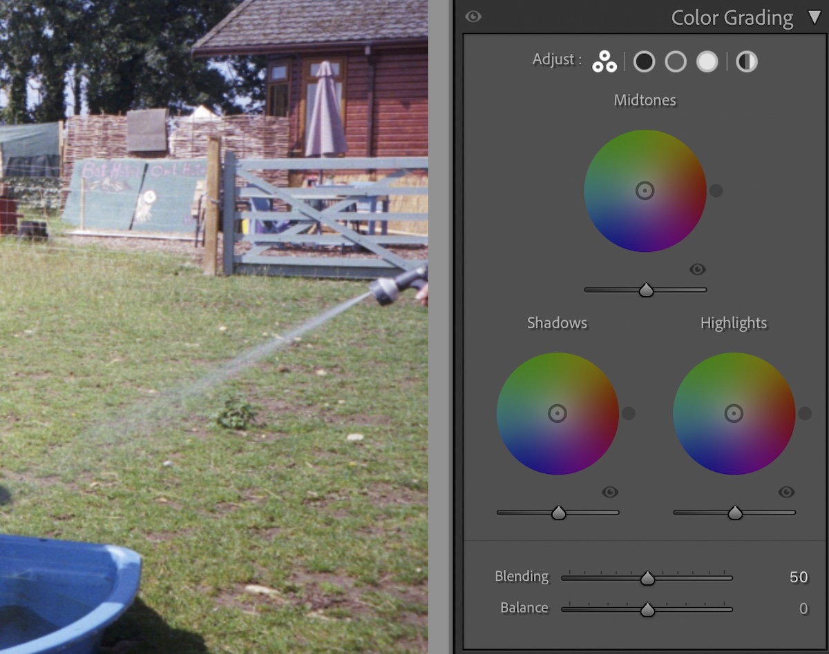 You will see three color wheels. Each represents a different section of the photograph: the shadows, midtones, and highlights. You can click the circle icons along the top to get a focused view of each wheel. You can also choose to adjust the color wheel globally.