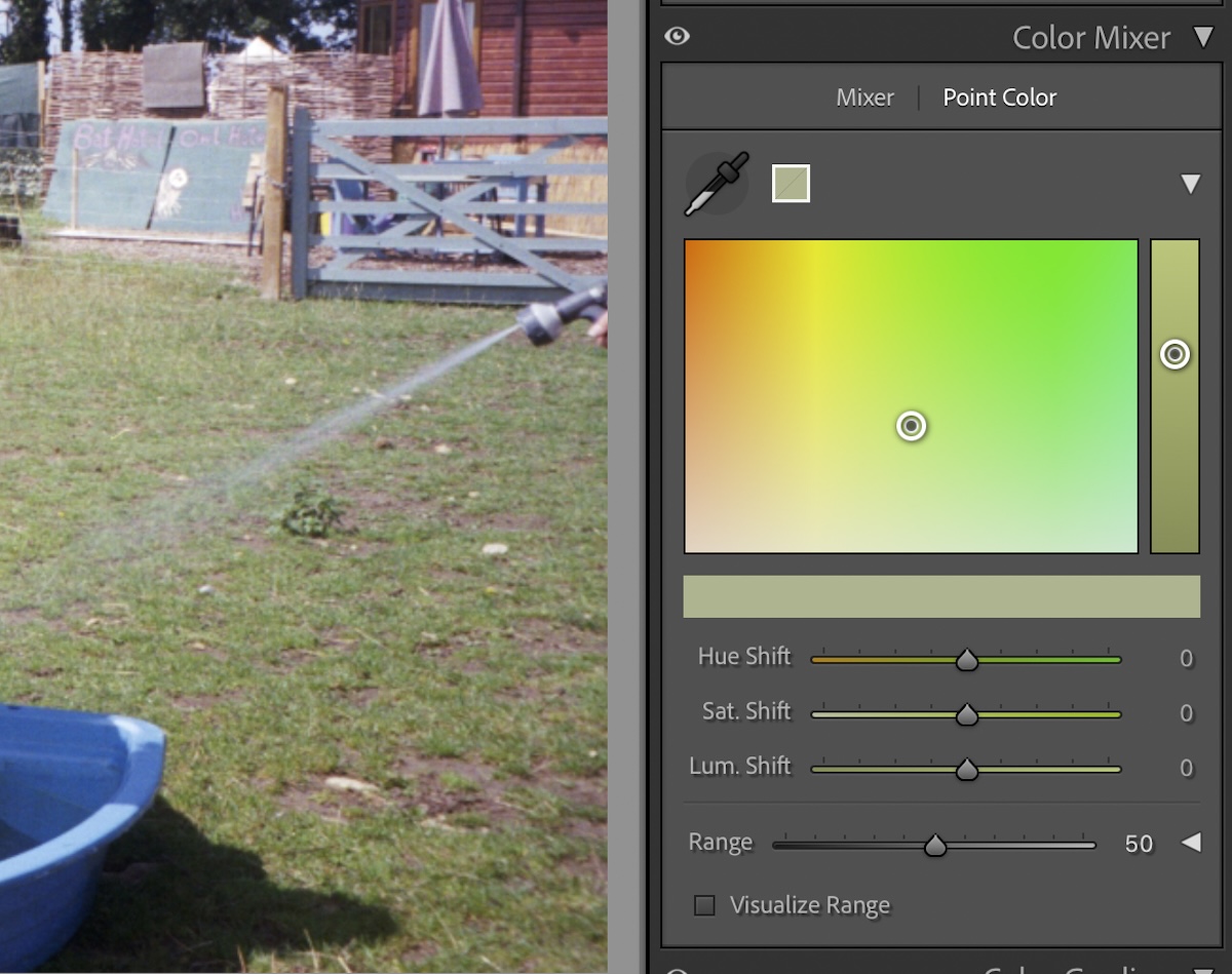 Point Color uses a Dropper to click directly onto your photograph to choose the color you want to edit. Once you have clicked on your photo, Lightroom will determine this pixel value and give you several adjustments to fine-tune this color.