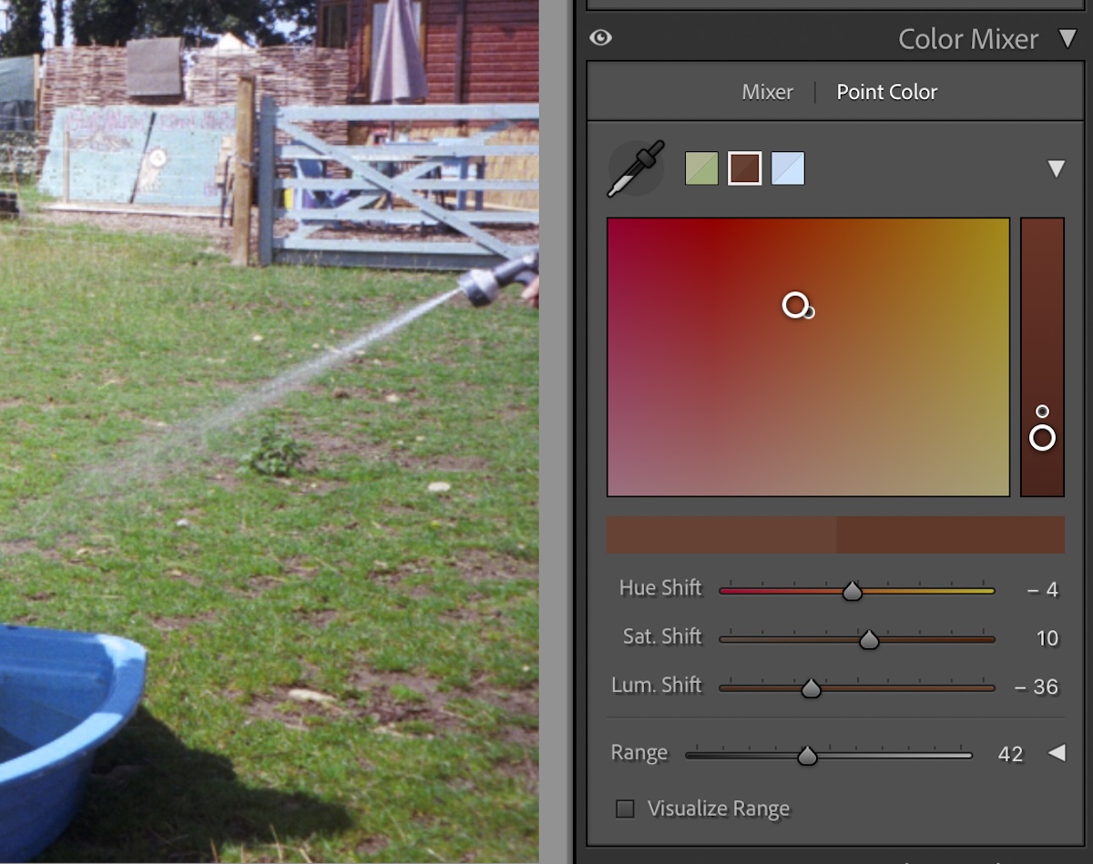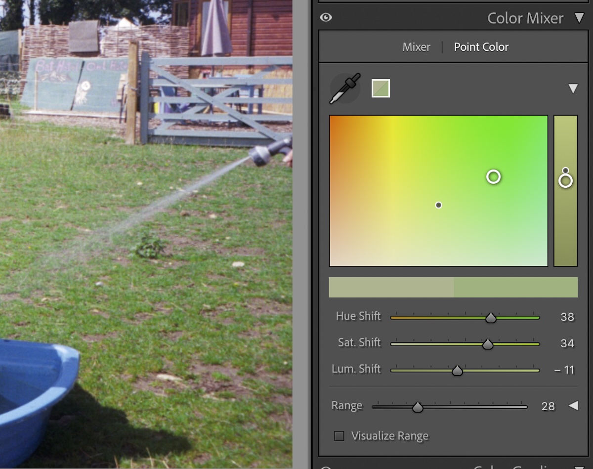 The Range adjustment here is important. It will ensure your targeted selection does not spill into other colors. There is even a Visualize Range button, which will produce an overlay on your photograph.