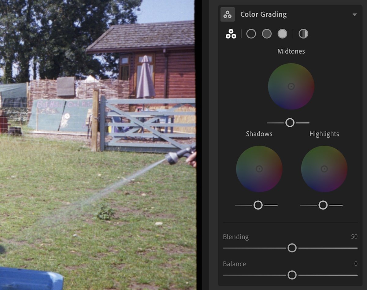 You will see three color wheels. Each represents a different section of the photograph: the shadows, midtones, and highlights. You can click the circle icons along the top to get a focused view of each wheel. You can also choose to adjust the color wheel globally.