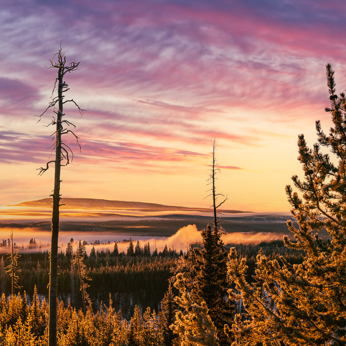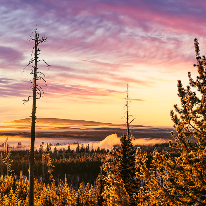 You can choose any colors you want to tone your image. For this sunrise, I used color grading to emphasize the tones already in the scene. I made the sun rays warmer by adding yellow and cooled down the forest shadows with a little blue. I added a little more pink to the clouds and brought the color into the foreground by adding it to the midtones. The subtle changes make the tones pop.