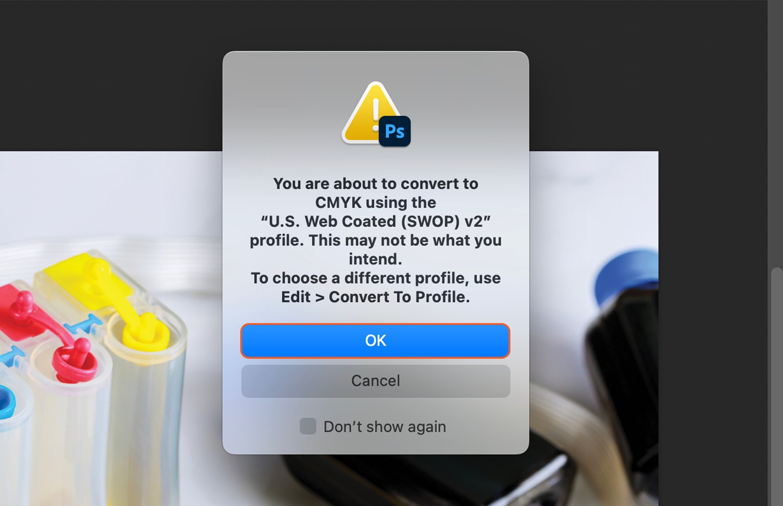 A dialogue box may appear to confirm the color mode change. If it does, click ‘OK’. If it doesn’t, proceed to the next step.