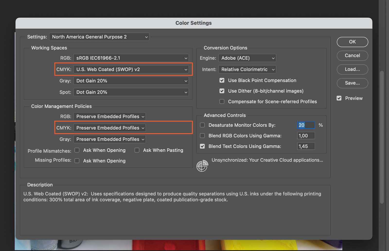 In the ‘Color Settings’ dialogue box, locate the ‘CMYK’ section. Click on the dropdown menu and choose the CMYK profile that suits your needs. Click ‘OK’ to save your settings.