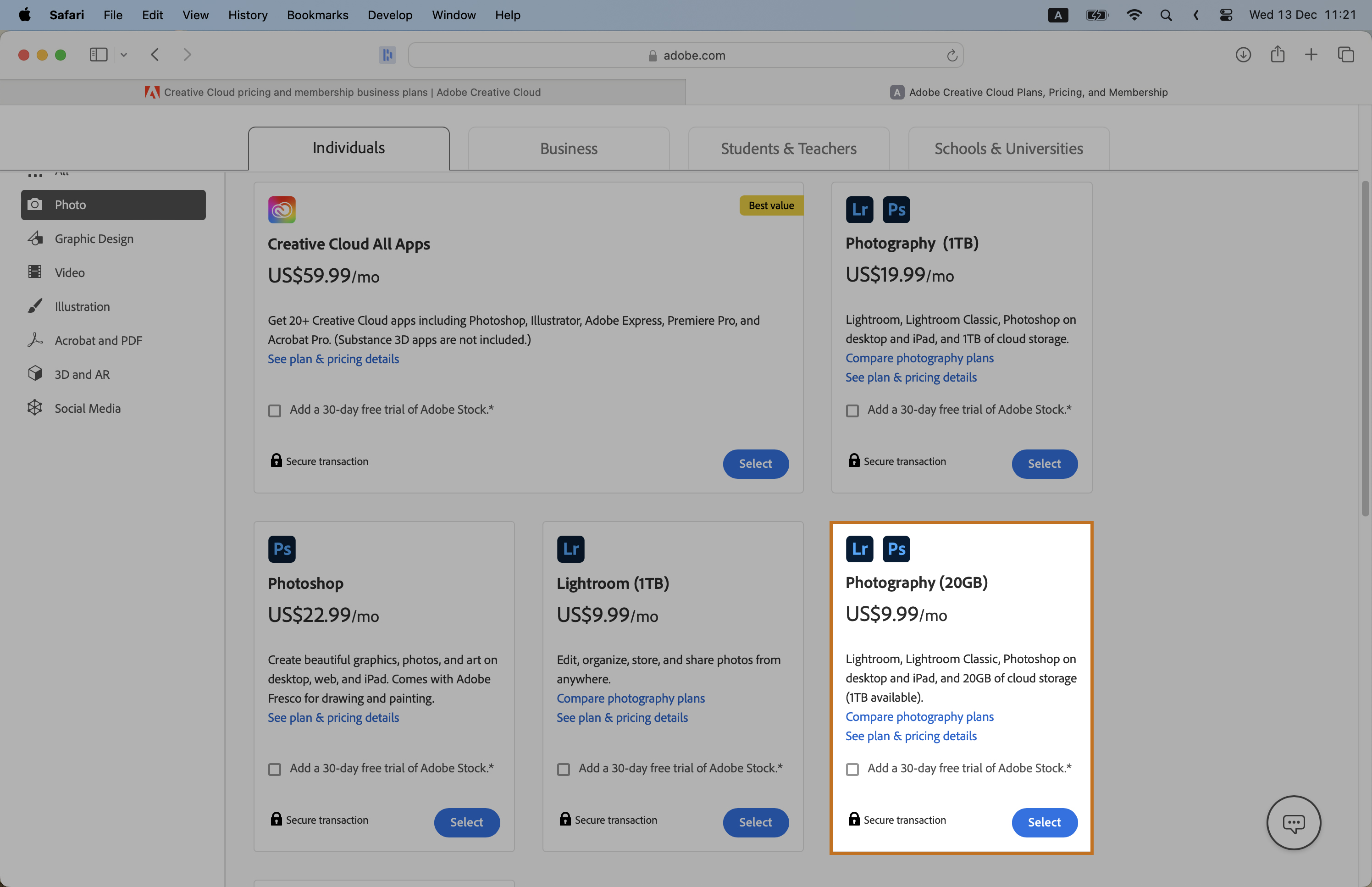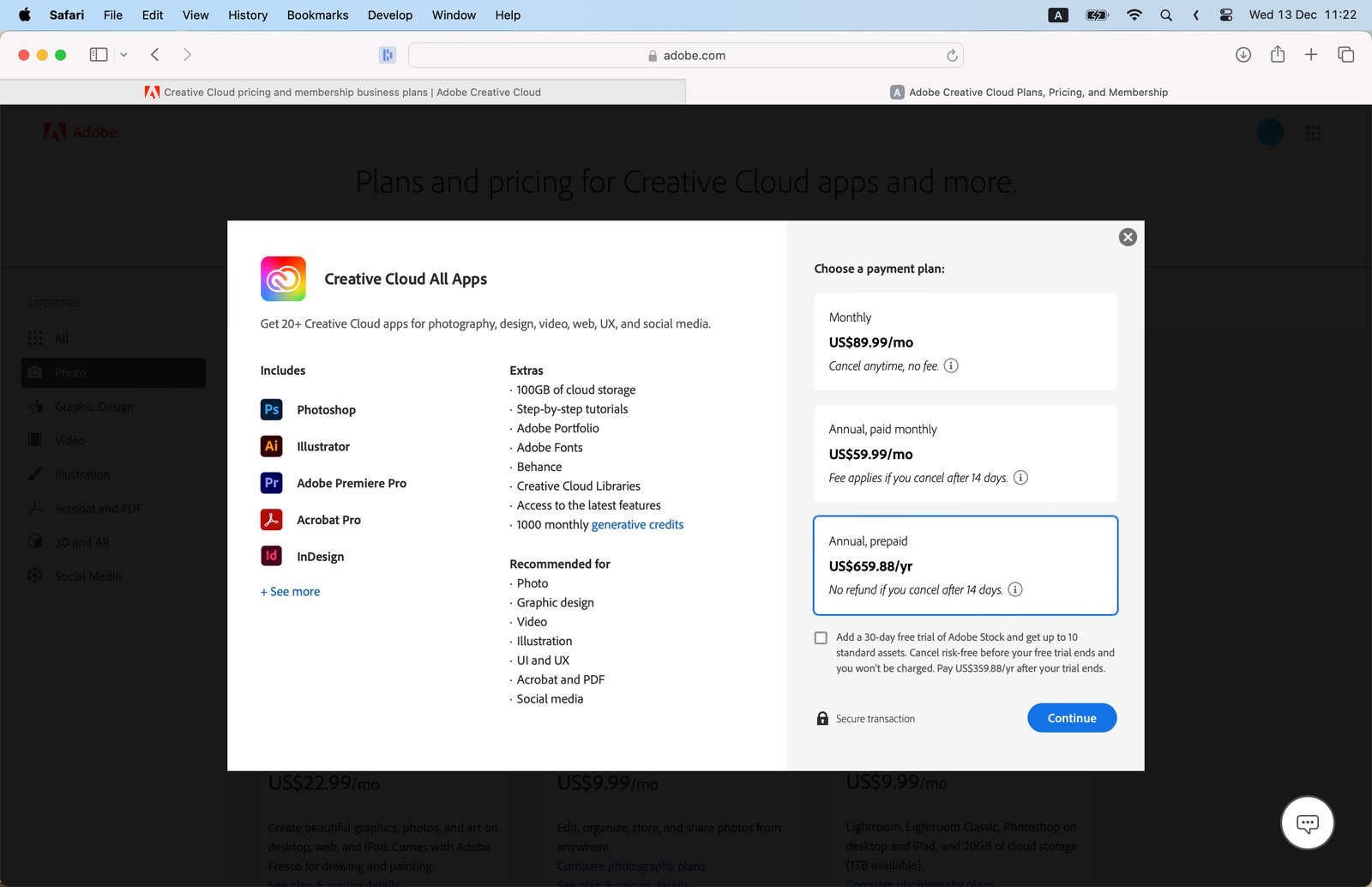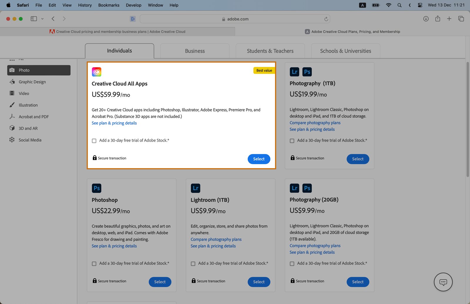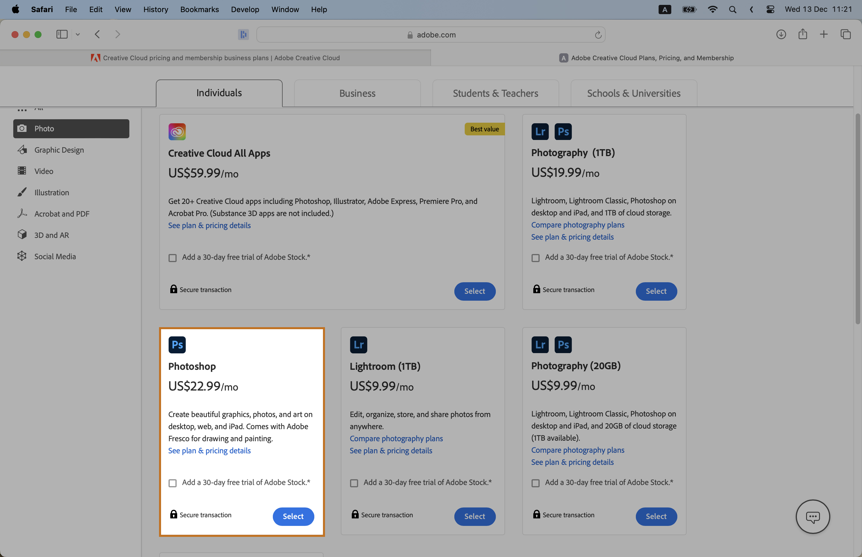 The All Apps Plan gives you access to all Adobe Creative Cloud apps, including Photoshop. Choose this if you need multiple Adobe softwares.