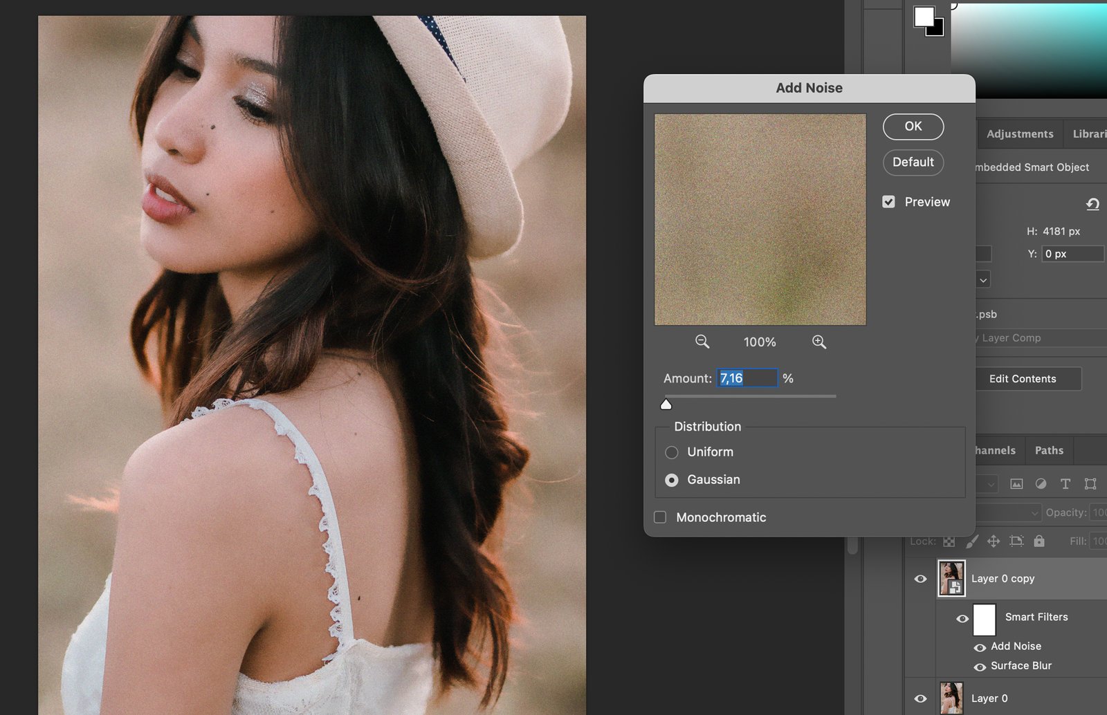 When adding noise, make sure to use the Gaussian distribution. This type of noise distribution results in a more realistic and less harsh effect.