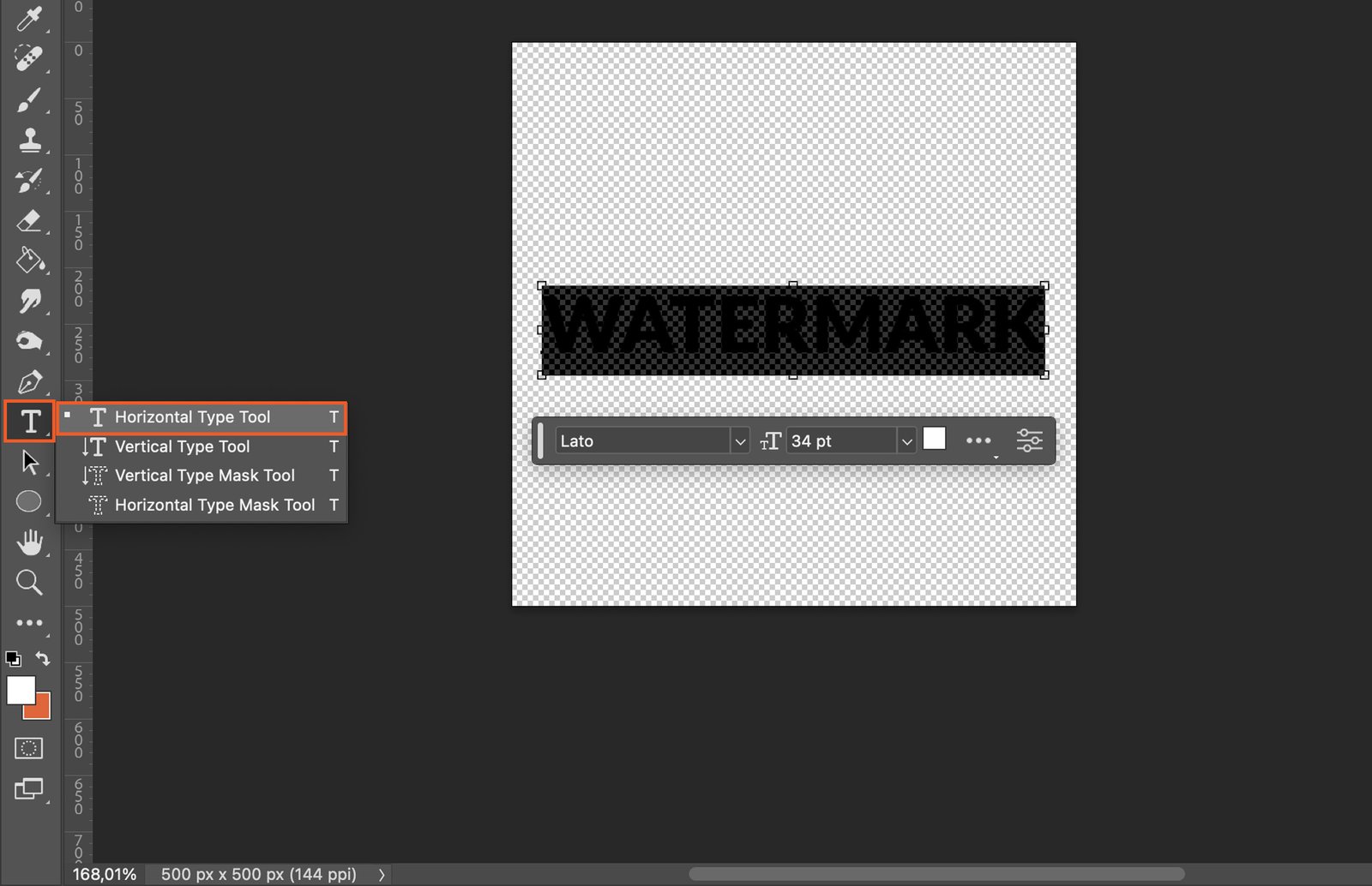 Select the Text Tool from the toolbar (or press ‘T’). Click on your canvas and type your watermark text. This could be your name, your business name, or your logo’s tagline.