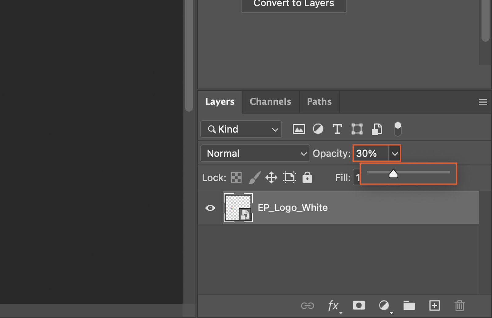 Select your watermark layer and reduce the Opacity in the Layers panel. Aim for 20-30% for subtle visibility.