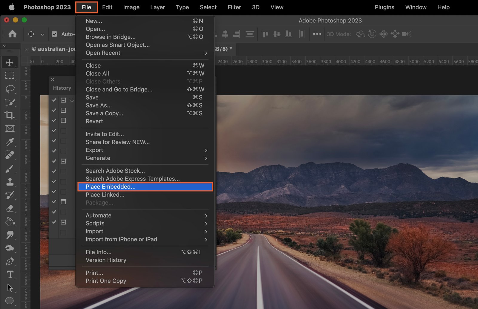 If you want to use a logo or image, go to File > Place Embedded. Navigate to your image file, select it, and click Place.