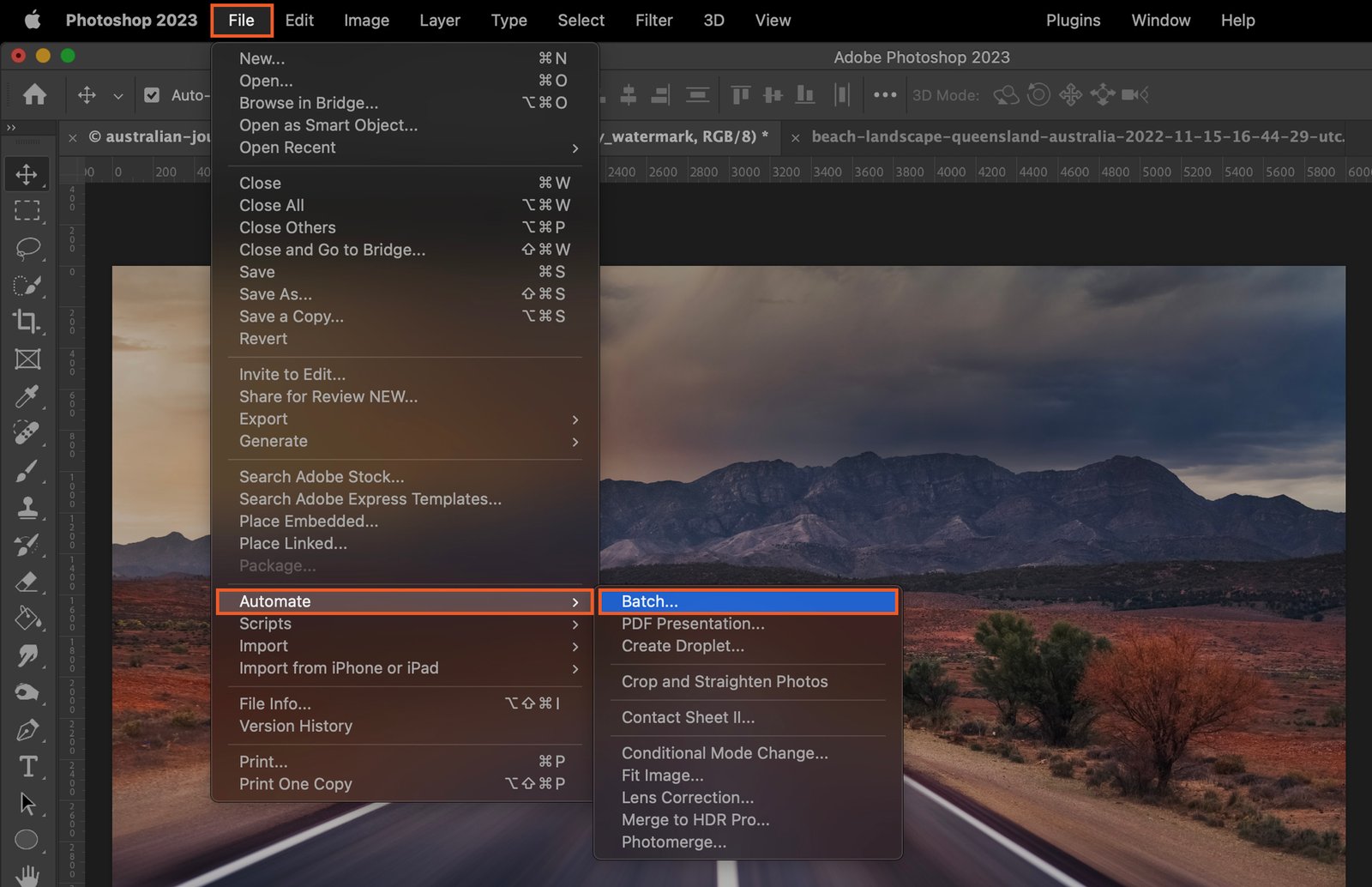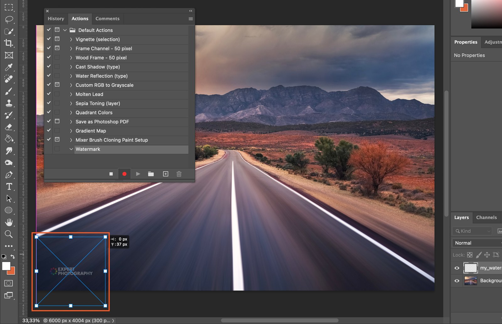 To speed up watermarking, create a Photoshop Action. Go to Window > Actions.