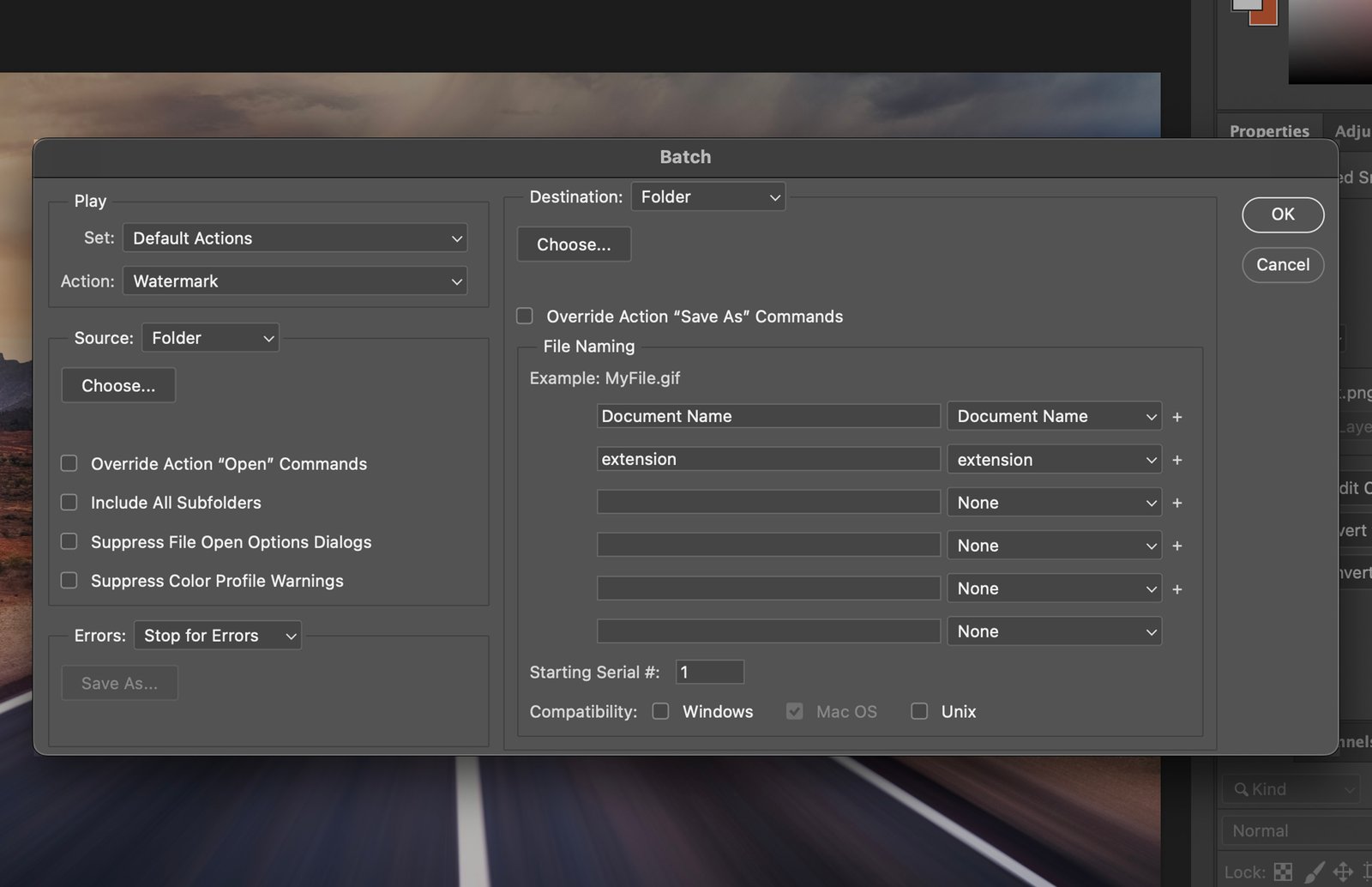 Choose the destination folder for your watermarked images. Click OK, and Photoshop will apply your watermark to all images in the source folder.