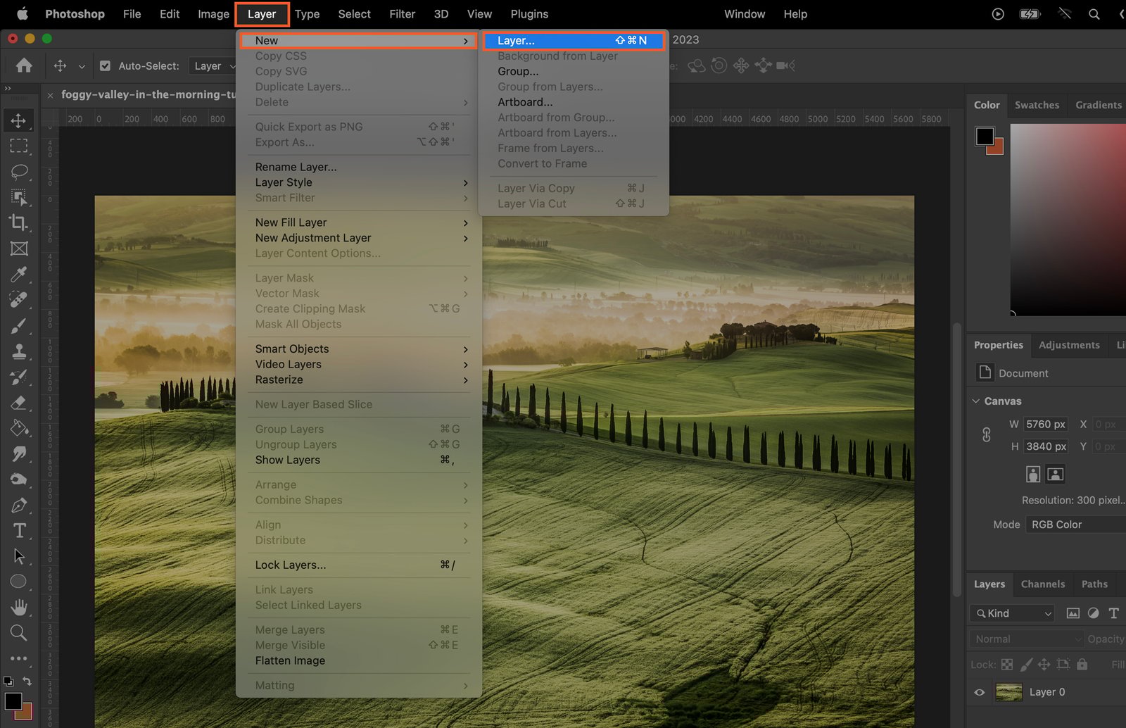 You can also go to the top menu. Choose ‘Layer’, then ‘New’, and finally ‘Layer’. A dialog box will pop up. Hit ‘OK’ to create your new layer.