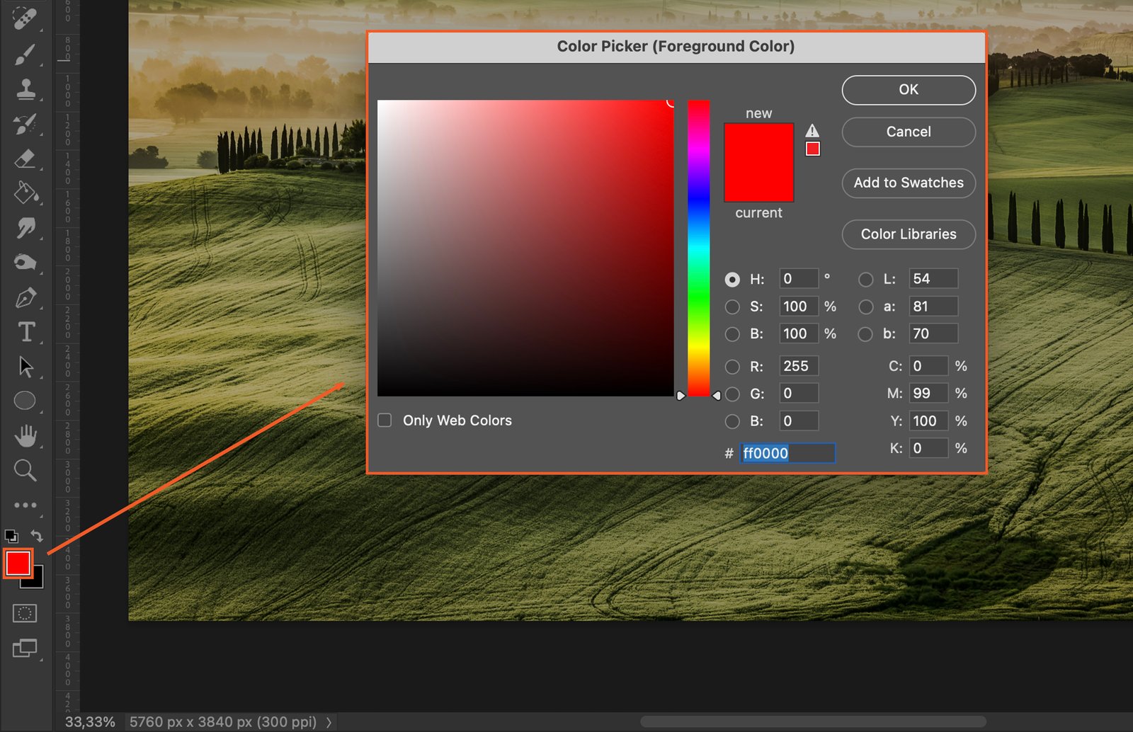 Click on the ‘Foreground Color’ box at the bottom of the tools panel. This opens the ‘Color Picker’ dialog box. Choose your color and hit ‘OK’.