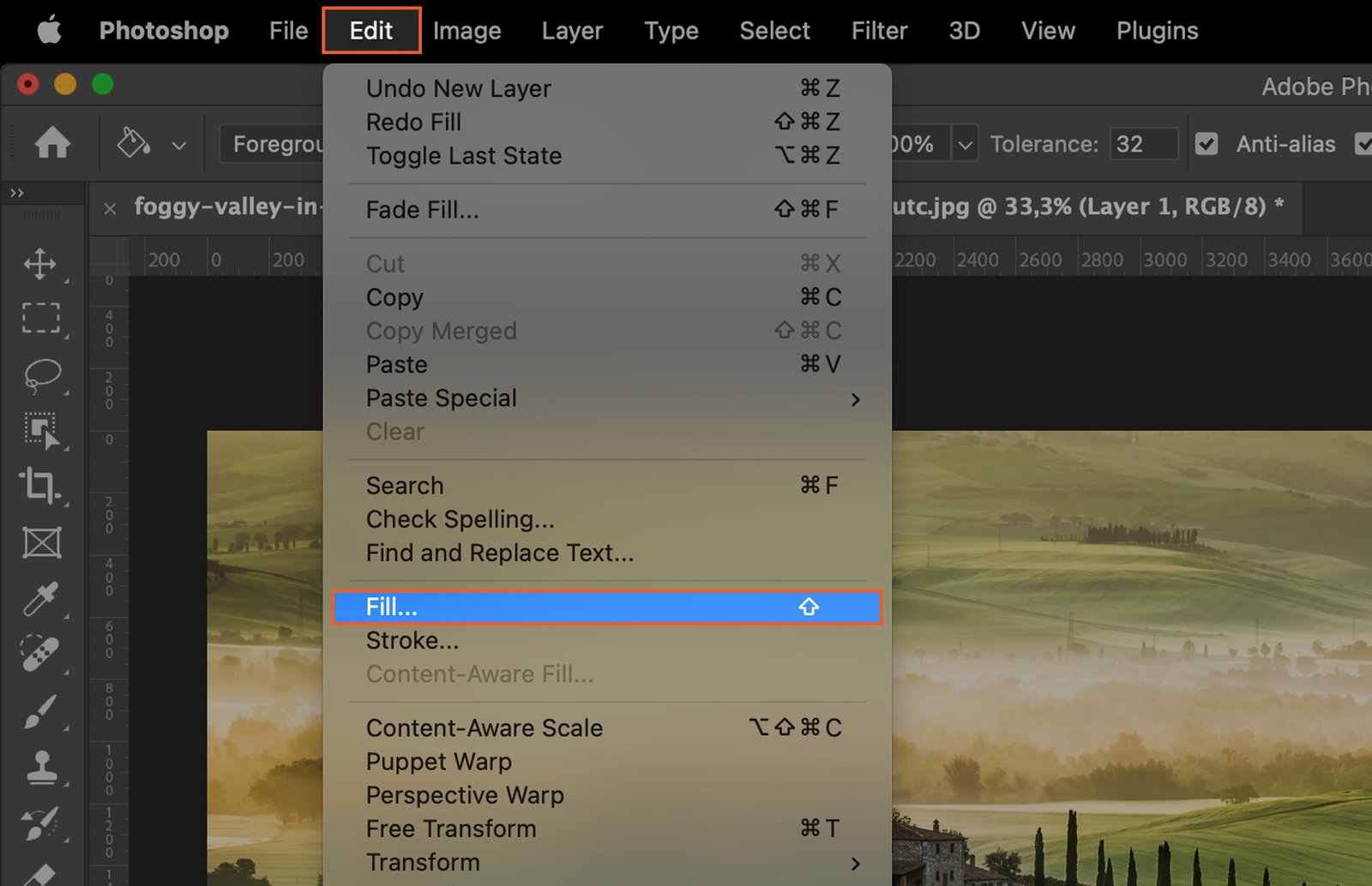 Alternatively, go to ‘Edit’ in the top menu. Choose ‘Fill’. In the ‘Contents’ section, make sure ‘Foreground Color’ is selected. Click ‘OK’.