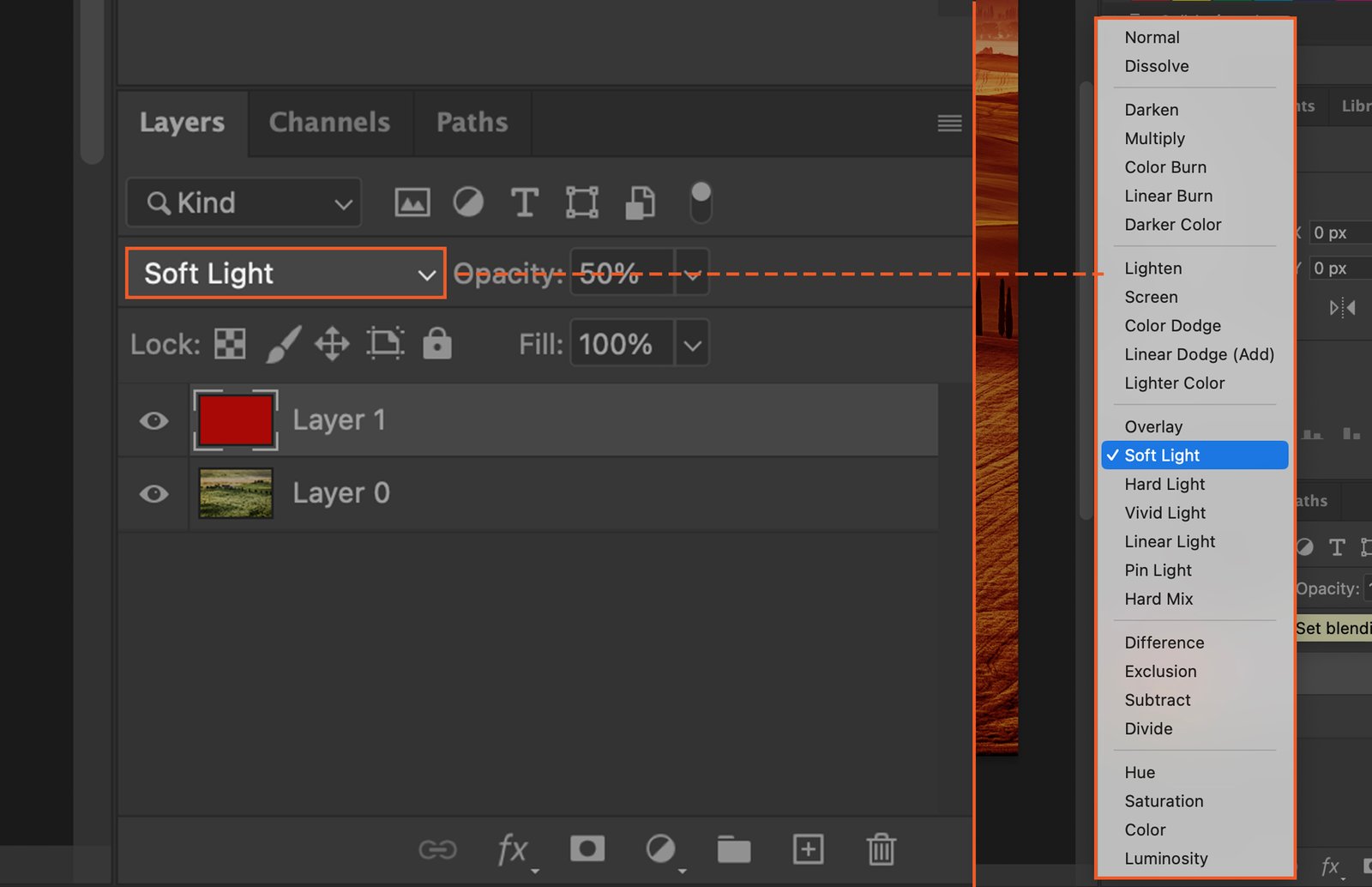 In the ‘Layers’ panel, you’ll see a drop-down box labeled ‘Normal’. Click on this and select ‘Overlay’. Your color layer now interacts with the layers beneath it, creating an overlay effect.