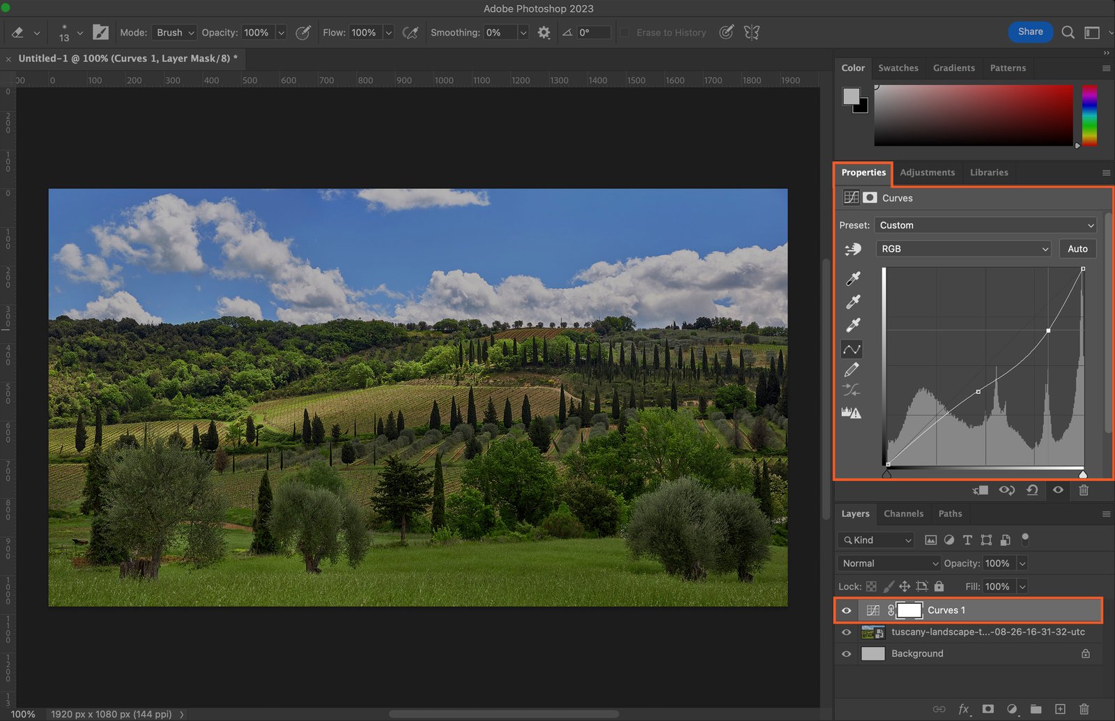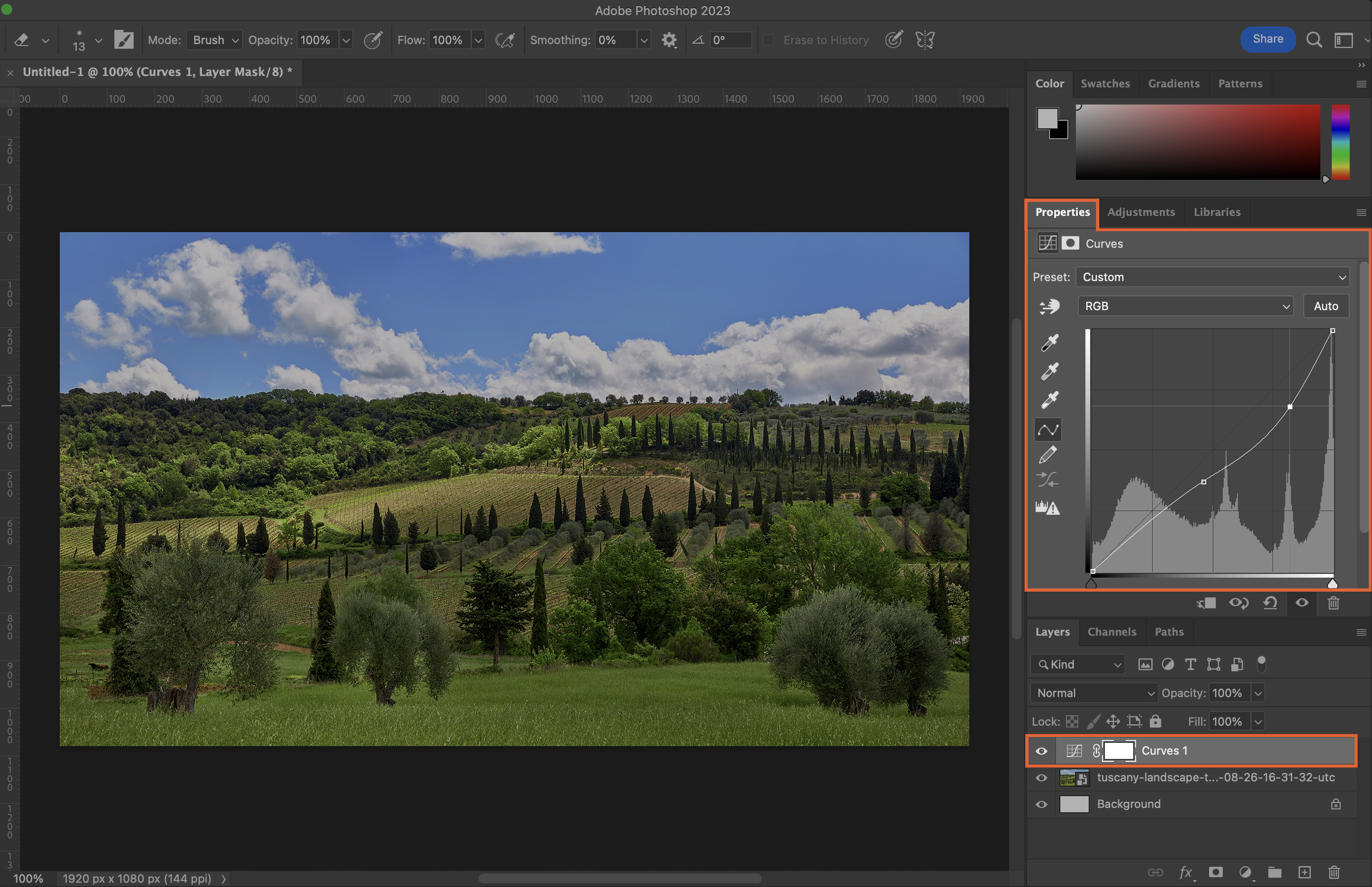 Curves adjustment lets you adjust the brightness and contrast in more detail. Access it via ‘Image > Adjustments > Curves’.