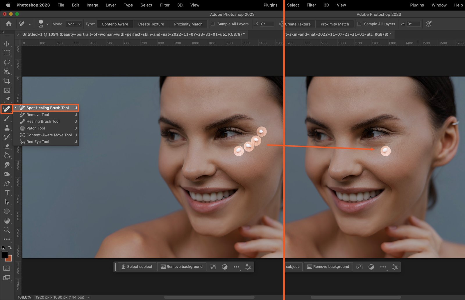 The Spot Healing Brush quickly removes blemishes and imperfections. Select the tool, adjust the brush size, and click on the area you want to fix.