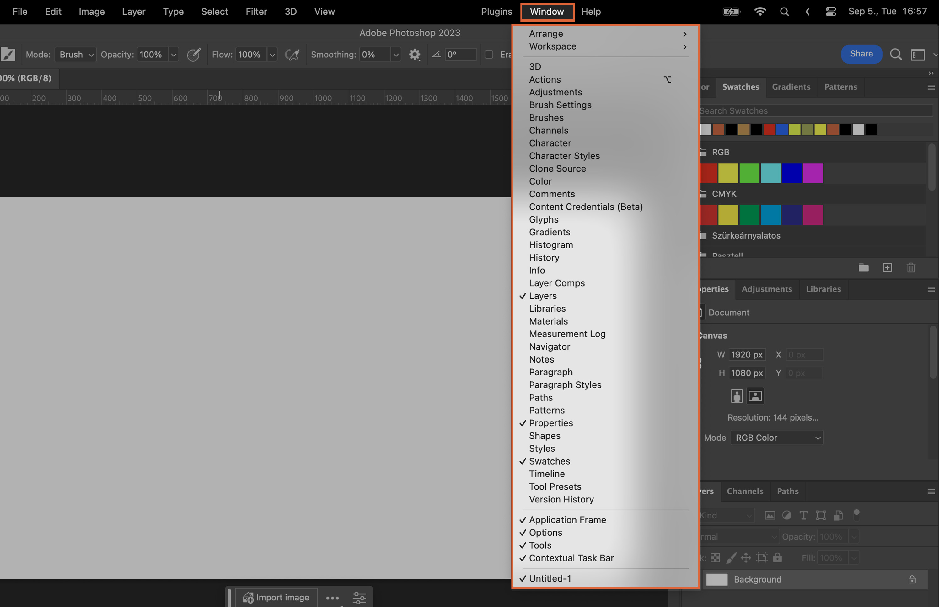 Panels in Photoshop contain features like layers, channels, and paths. You can rearrange these panels by clicking and dragging them. To add a panel, simply go to ‘Window’ in the menu bar and select the one you need.