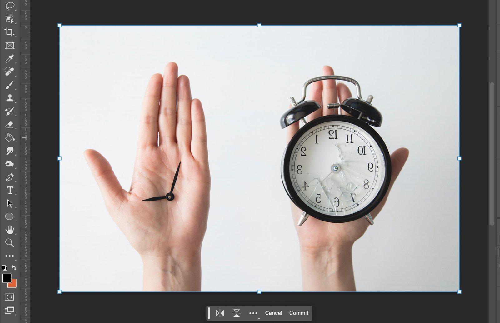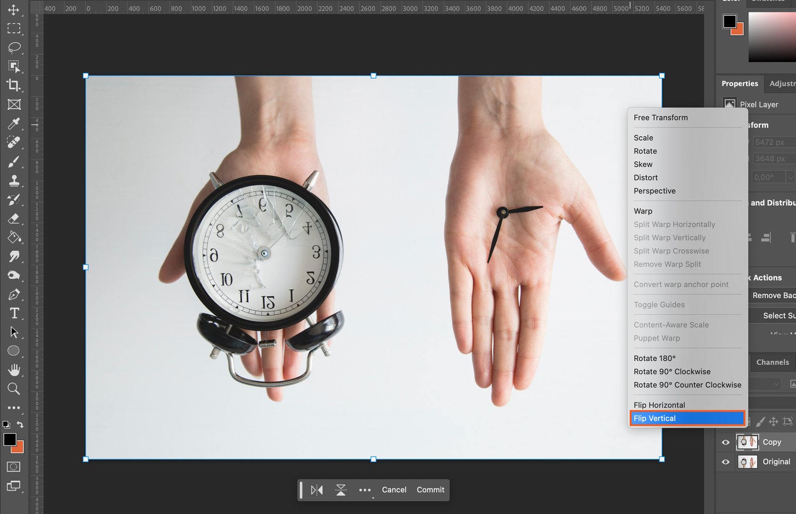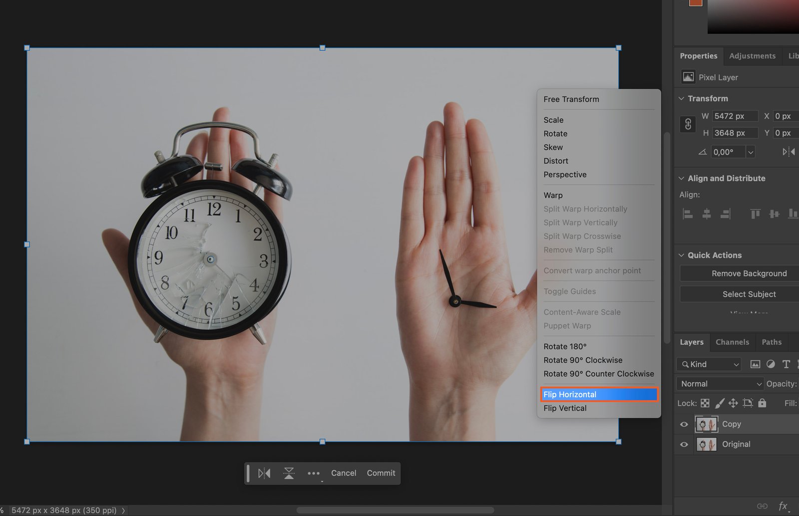 For the keyboard savvy, press Ctrl+T (Windows) or Command+T (Mac) to activate the Transform Tool. Right-click within the transform box and select the flip option you want.