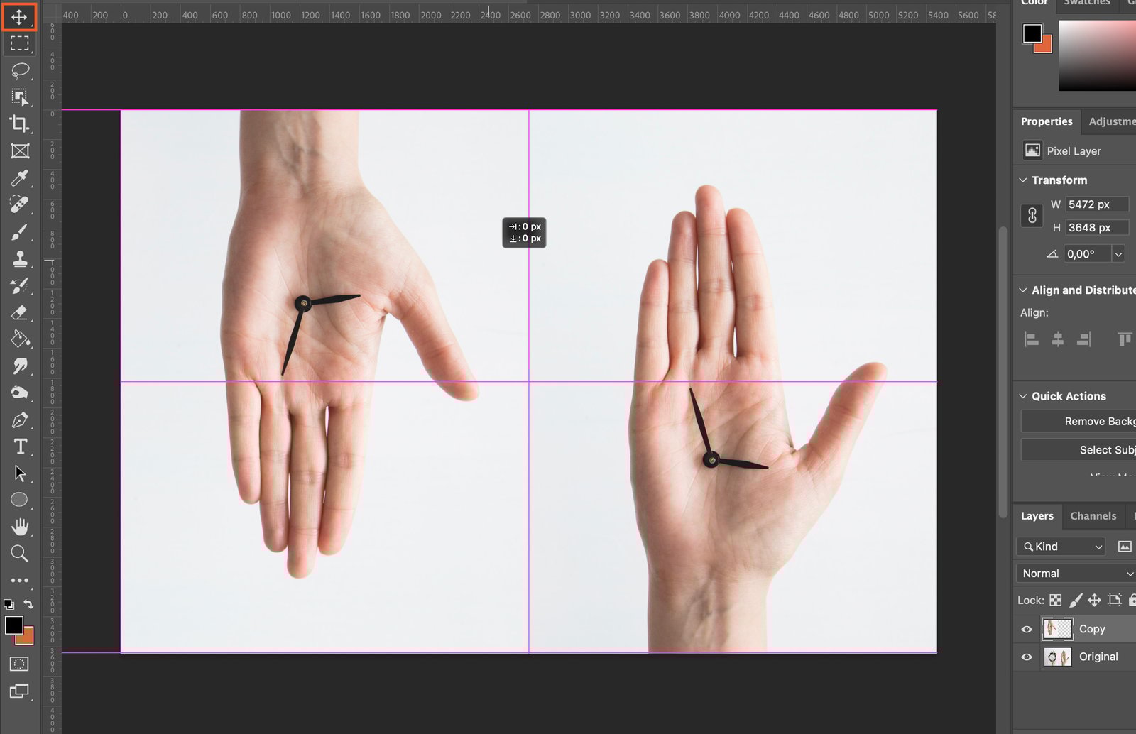 For precision, use arrow keys to nudge the layer pixel by pixel until perfectly aligned.