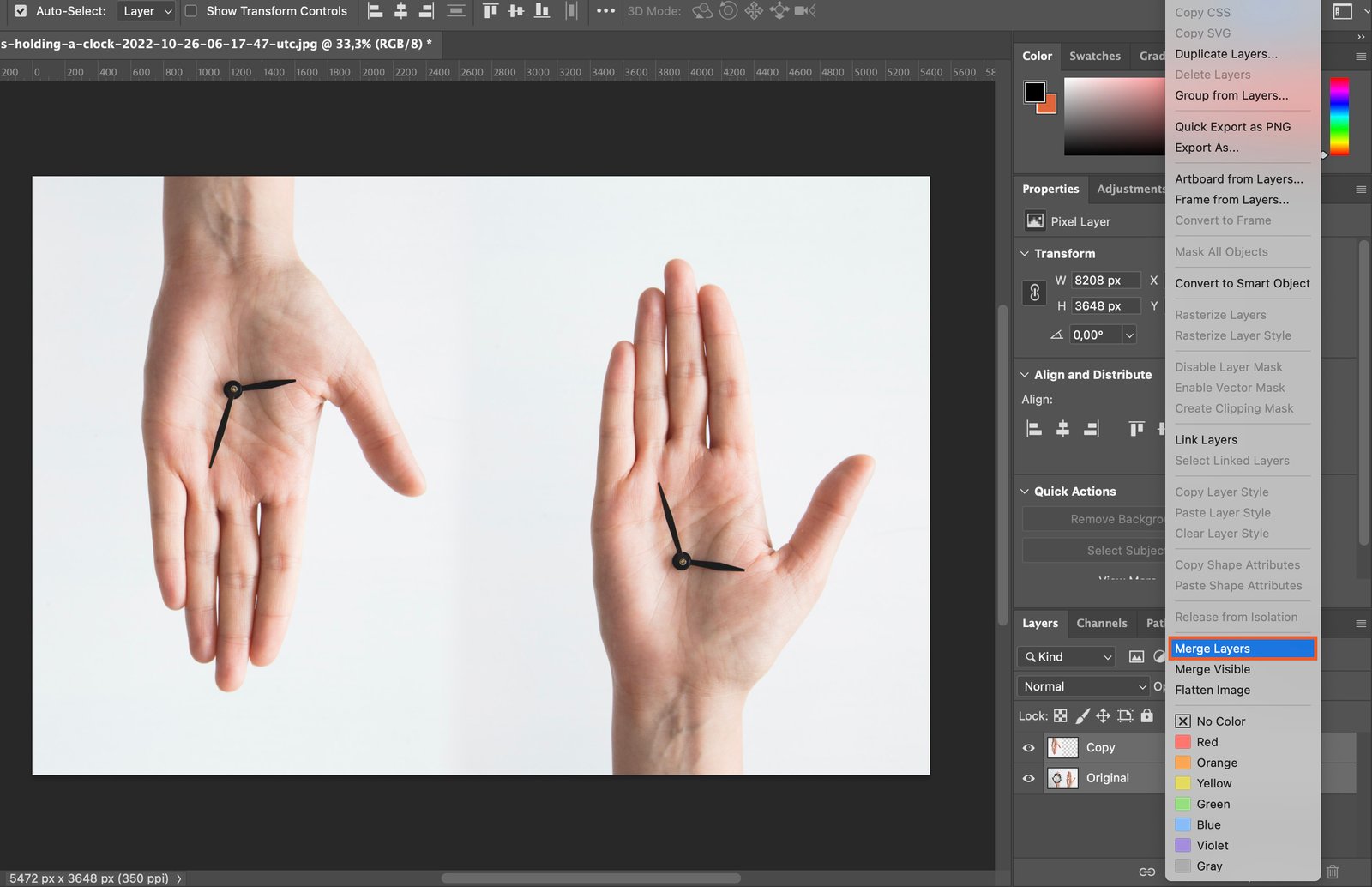 Alternatively, select both layers, right-click on the image in the workspace and choose ‘Merge Layers’ from the context menu.