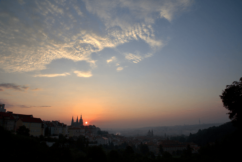 A picture of the sun rising behind Prague castle