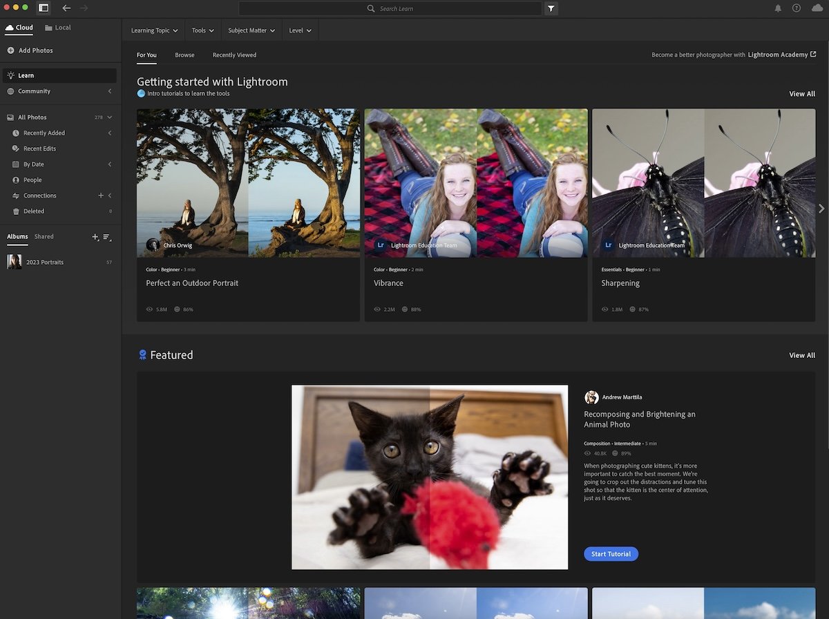 Lightroom is a better option for beginners, with a simpler interface and more intuitive controls. Learning your way around the application will take less time, and therefore, you will be able to use it with confidence sooner. In fact, Lightroom has an integrated Learn section to help you directly from the app.