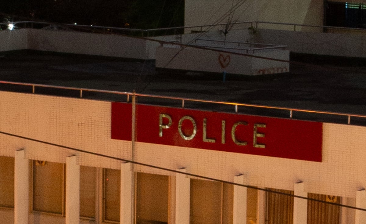 PhotoLab’s denoise tool effectively removes noise from the shadows above the police sign. The clarity difference comes from RAW processing rather than noise reduction.