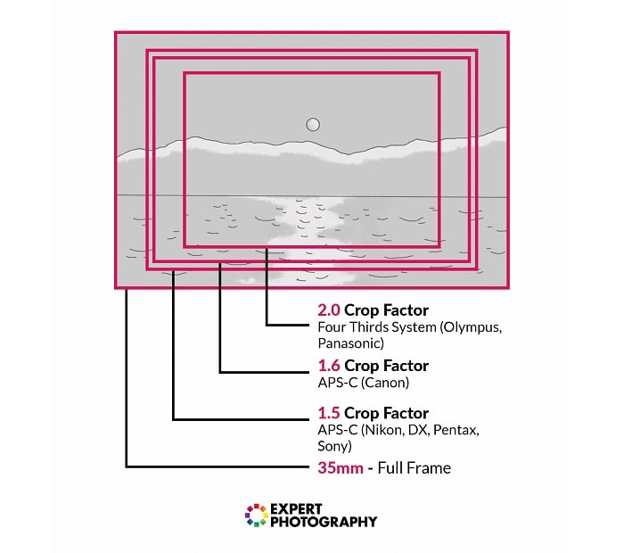 There is no crop factor with a full frame sensor. So if you’re attach a 50mm lens to your full frame camera, you get a true 50mm field of view. We’ll go into more detail on crop factor later in the article.