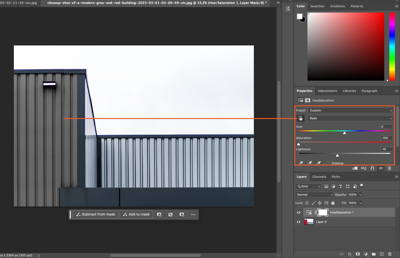 After selecting the color, adjust the “Saturation” slider to the left to lower its intensity. Continue lowering the saturation until the color is effectively removed from your image.