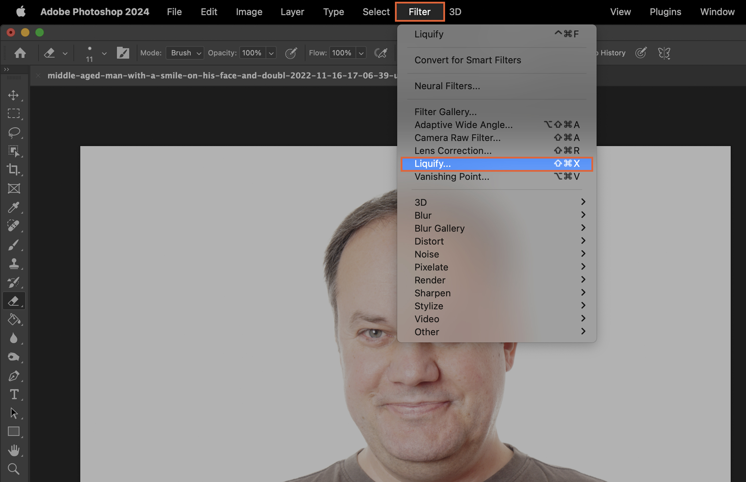 Select the Liquify Tool. This tool allows us to push, pull and twist the pixels to subtly reshape the chin area.