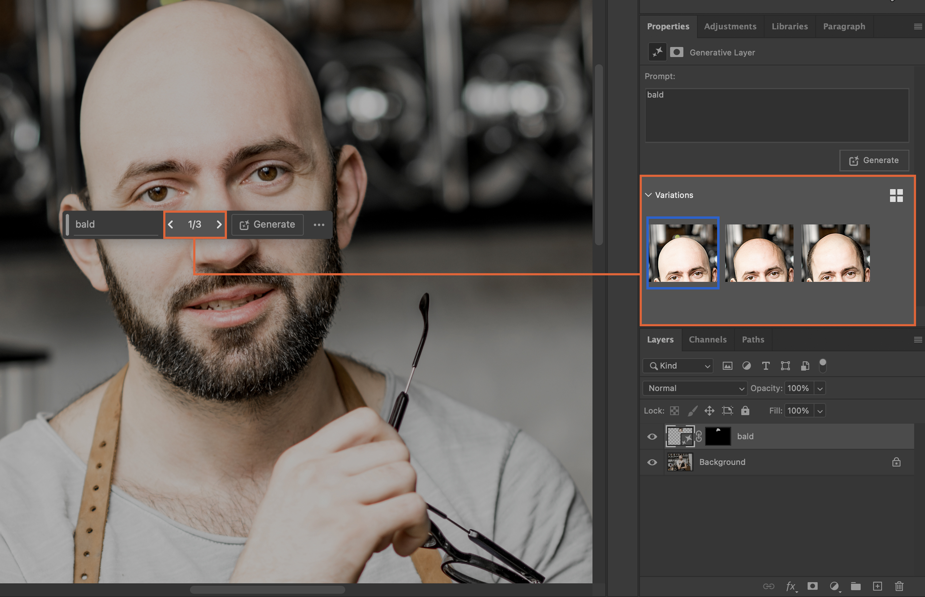 After the Generative Fill has done its magic, you’ll typically be presented with multiple variations. Your final step is to select the most suitable result from these variations, ensuring a seamless hair removal in your image.
