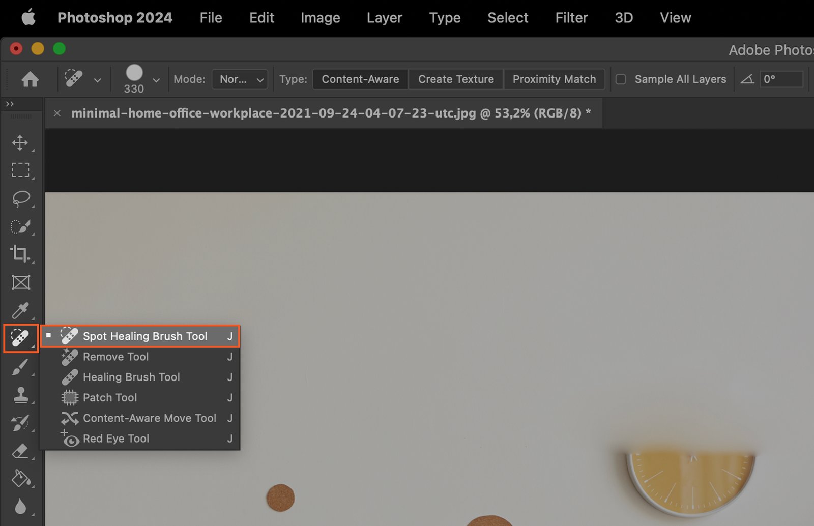 The Spot Healing Brush is best for small blemishes. Just click on the area you want to fix, and Photoshop will automatically replace it with matching pixels.