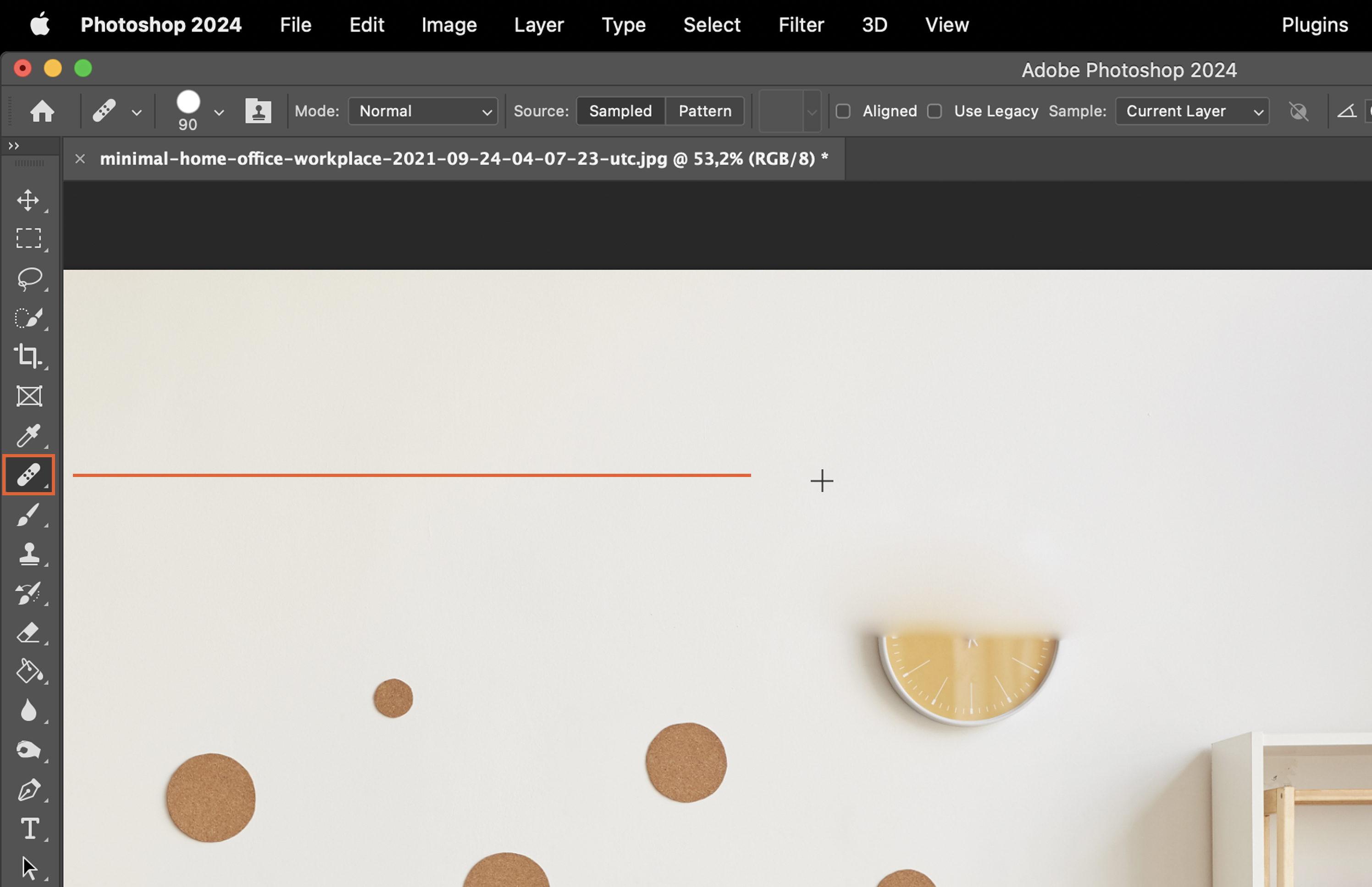 The Healing Brush Tool is similar to the Clone Stamp, but it also blends the pasted pixels with the surrounding area. This tool is best for smaller, detailed areas.