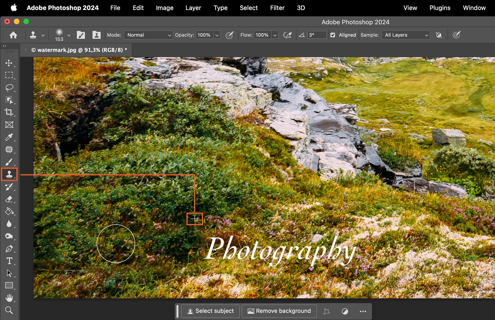 The Clone Stamp tool allows you to manually select the sample area which will replace the watermark. This tool offers more control and precision, making it suitable for intricate removal tasks.