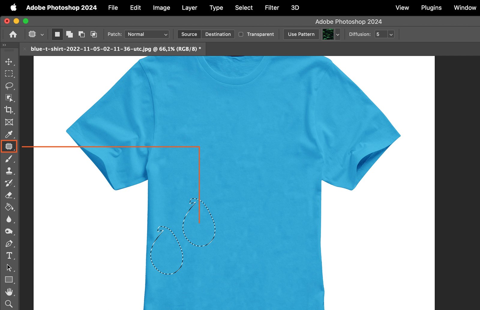 For larger wrinkles or more complex patterns, use the Patch Tool. This tool replaces a selected area with another area of your choice.