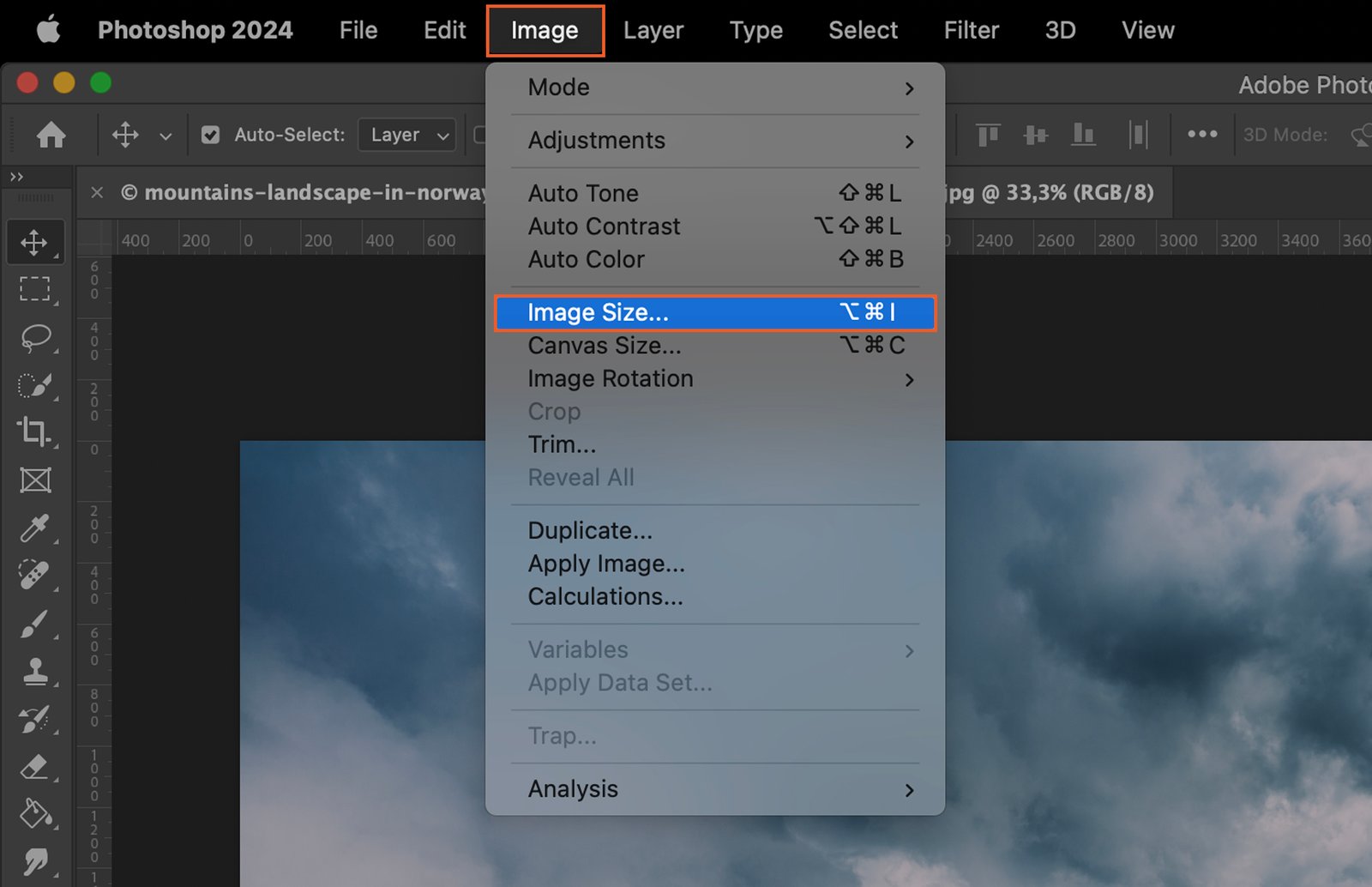 Open the Photoshop application and load the image you want to resize. Once your image is opened, find the “Image” menu at the top of the toolbar.