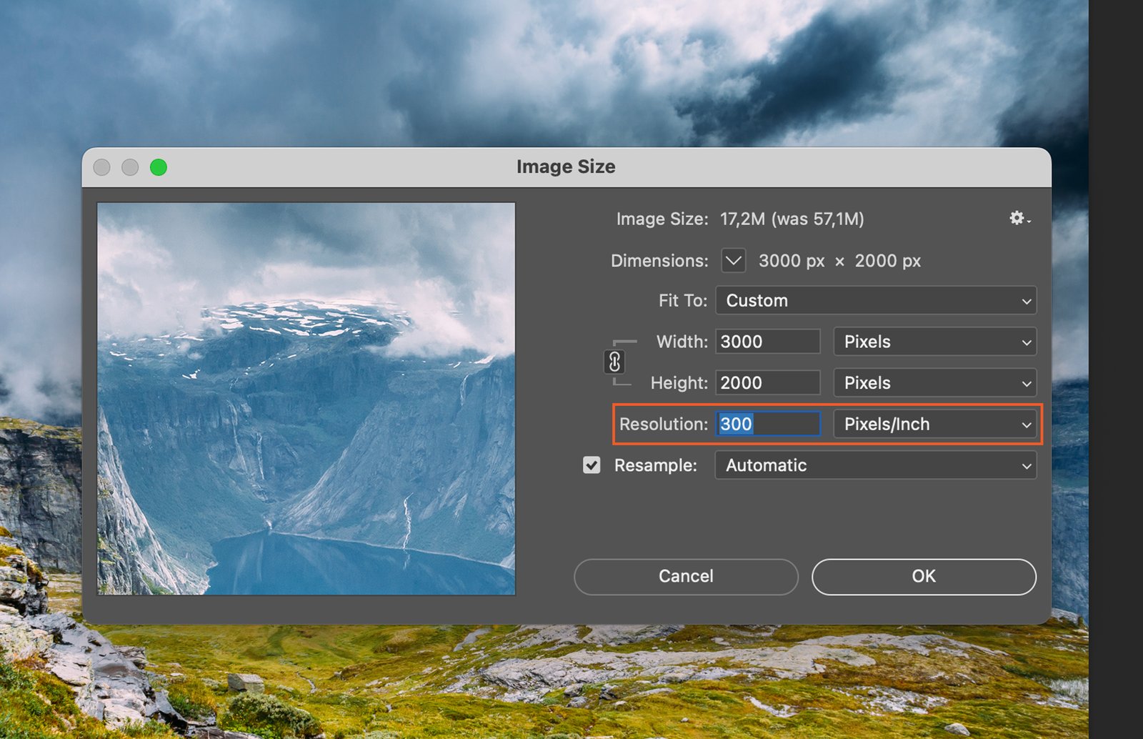 In the dialog box that appears, you’ll see two boxes for Width and Height. These represent the current dimensions of your image.